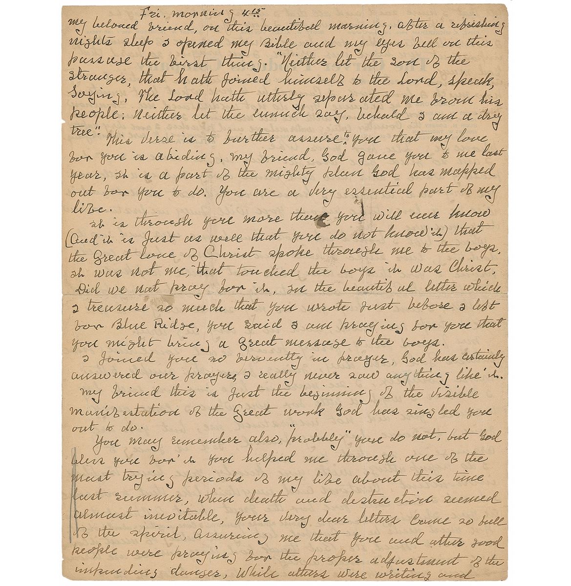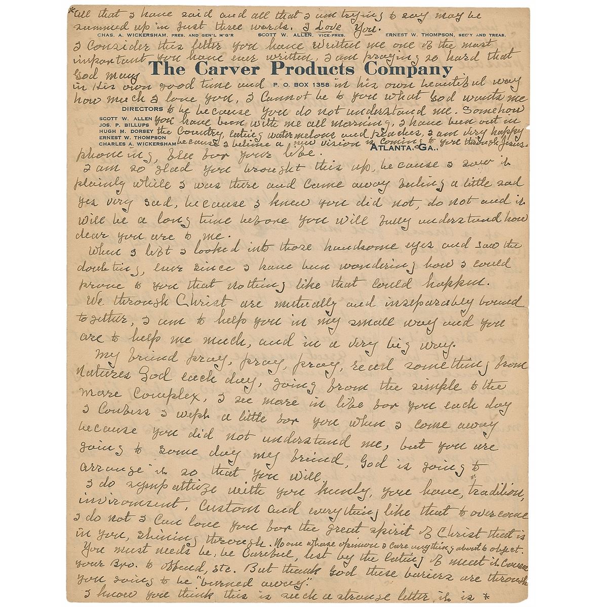 Partial ALS, unsigned, one page, both sides, 8.5 x 11, The Carver Products Company letterhead, no date. Page from a deeply spiritual letter concerning race to Jim Hardwick, a young Virginian and descendent of a slaveowner. In part: “I confess I wept a little bit for you when I came away because you did not understand me, but you are going to some day my friend, God is going to arrange it so that you will. I do sympathize with you keenly, you have tradition, environment, custom and everything like that to overcome. I do not. I can love you for the great spirit of Christ that is in you, shining through…thank God these barriers are through you going to be ‘burned away’…My friend, God gave you to me last year, it is a part of the mighty plan God has mapped out for you to do. You are a very essential part of my life…you helped me through one of the most trying periods of my life about this time last summer, when death and destruction seemed almost inevitable, your very dear letters came…assuring me that you and other good people were praying for the proper adjustment of the impending danger.” In fine condition, with intersecting folds and a couple tiny edge separations.