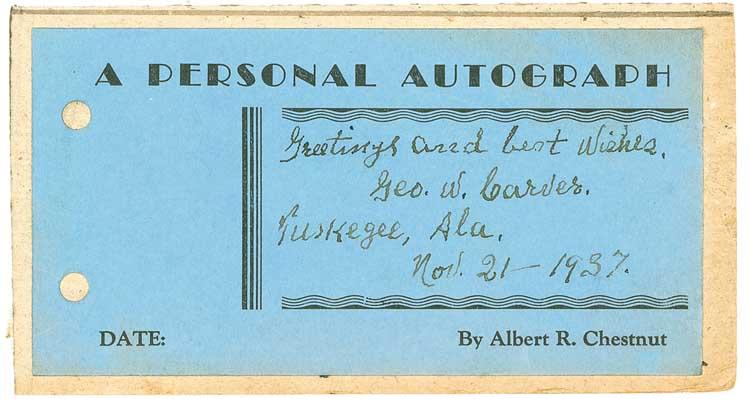 Vintage fountain pen signature, “Greetings and best wishes, Geo. W. Carver, Tuskegee, Ala, Nov 21, 1937,” on a 5.5 x 2.75 blue card from the Albert R. Chestnut collection. Attached to a slightly larger heavy gray card and in fine condition, with scattered light soiling. From his Pennsylvania home, Chestnut, a printer by profession, began collecting autographs in 1935. He sent these personally-printed cards to over a thousand celebrities and received favorable replies from the vast majority, finally retiring from collecting to raise his family when postage increased from 2¢ per card! Pre-certified PSA/DNA and RRAuction COA.