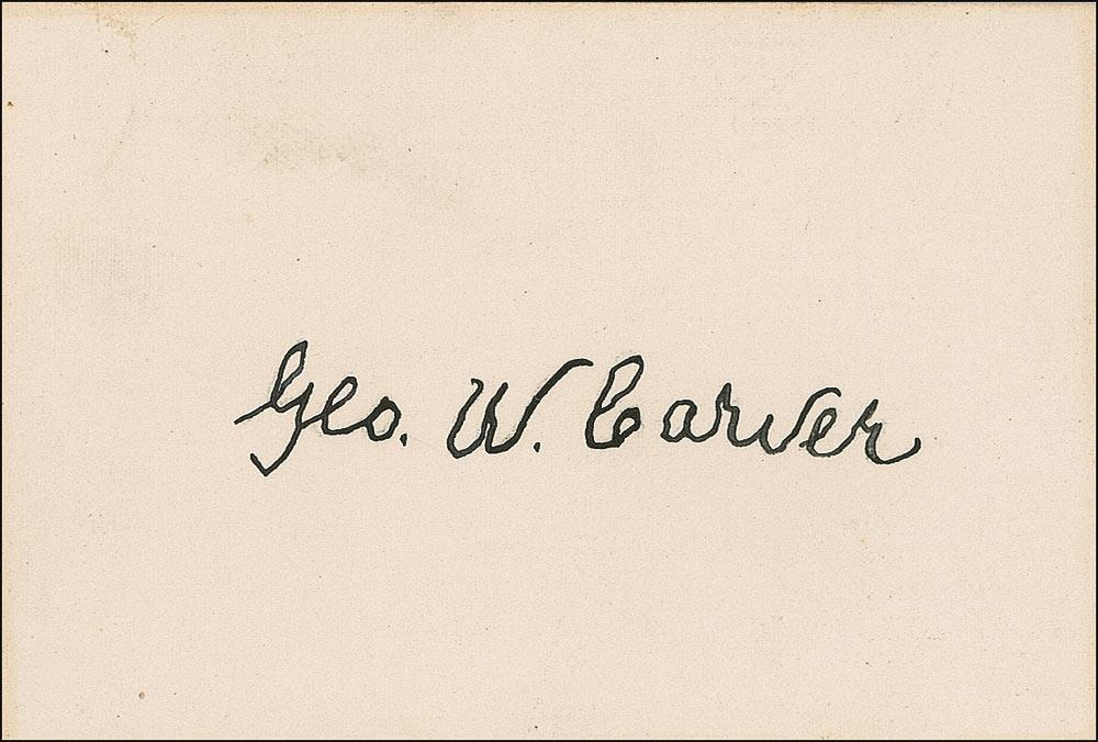 Vintage fountain pen signature, “Geo. W. Carver,” on a white 3.5 x 2.25 card. In fine condition, with light edge toning and scattered faint soiling. Pre-certified PSA/DNA and RRAuction COA.