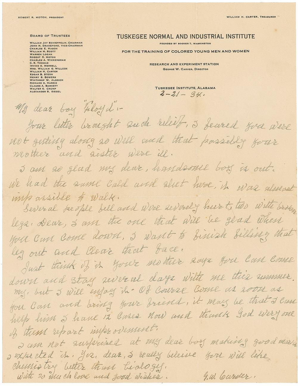 ALS signed “G. W. Carver,” one page, 8.5 x 11, Tuskegee Normal and Industrial Institute letterhead, February 21, 1934. Letter to “My dear boy ‘Floyd.’” In part: “We had the same cold and sleet here, it was almost impossible to walk. Several people fell and were severely hurt, two with broken legs. Dear, I am the one that will be glad when you can come down. I want to finish filling that leg out and clear that face…Of course come as soon as you can and bring your friend, it may be that I can help him I have 12 cases now and thank God every one of them report improvement.” Intersecting folds and a uniform shade of toning, otherwise fine condition. Accompanied by the original mailing envelope.
