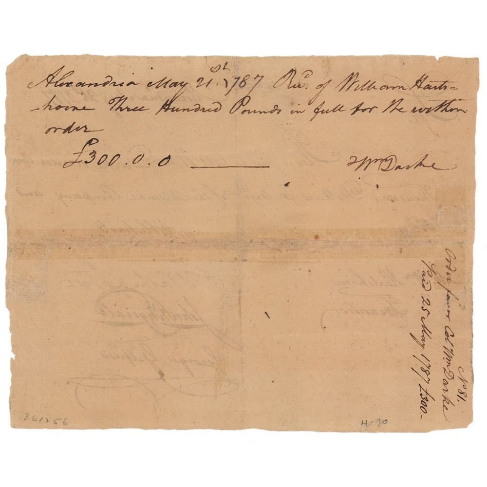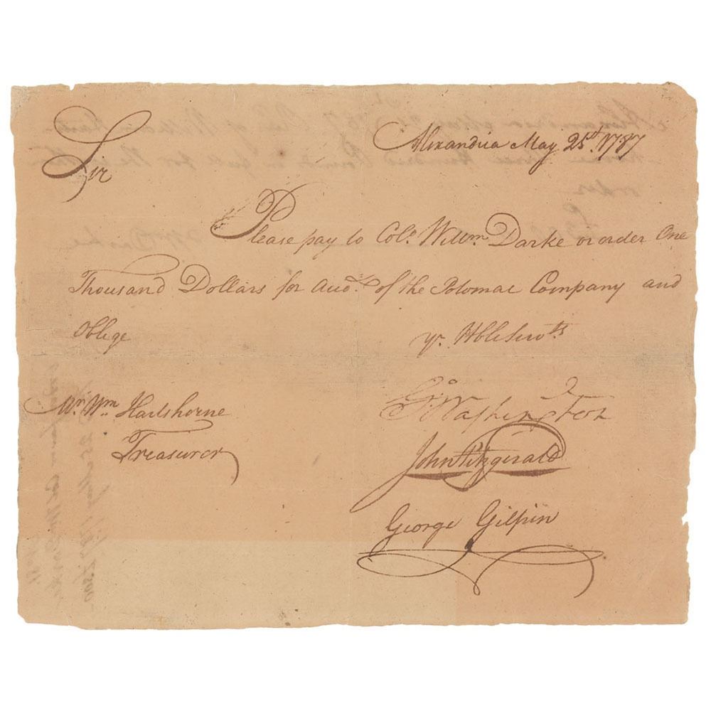 Manuscript DS, signed “Go: Washington,†one page, 7.5 x 6, May 25, 1787. Pay order directed to William Hartshorne, treasurer of the Potomac Company. In full: "Please pay to Colo. William Darke or order One Thousand Dollars for acco. of the Potomac Company." Signed at the conclusion by George Washington, John Fitzgerald, and George Gilpin as directors of the Potomac Company. Endorsed on the reverse by Darke, "Wm. Darke," to confirm receipt of £300. In fine condition, with light toning, and nicely done repairs to small tears and fold splits.