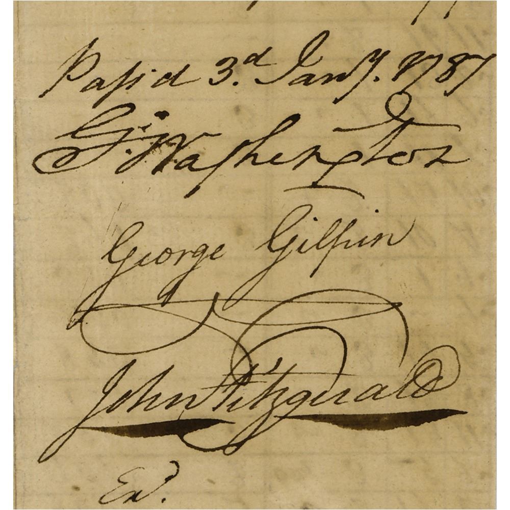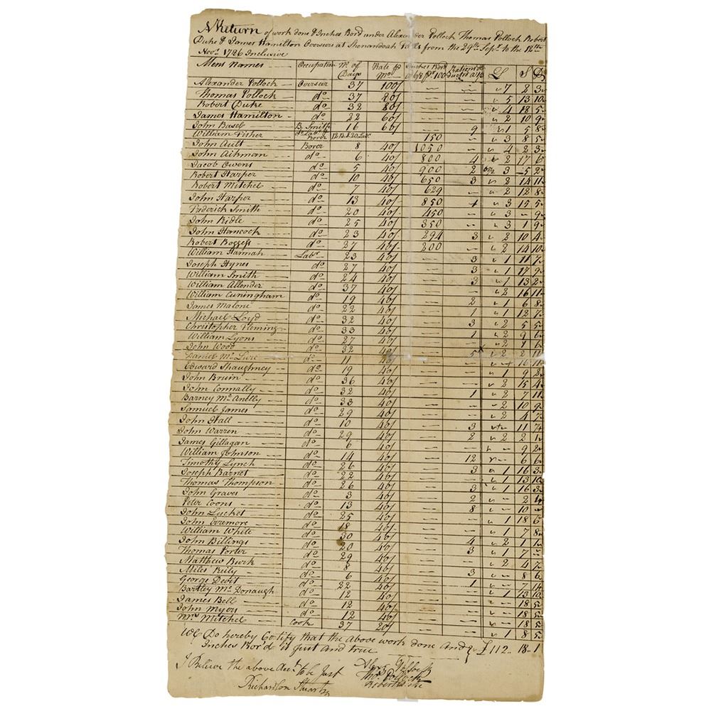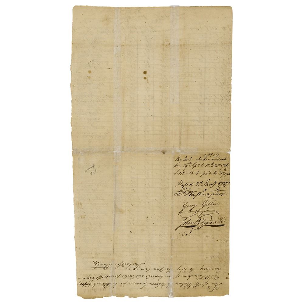 Manuscript DS, signed “Go: Washington,†one page, 8.75 x 16, January 3, 1787. Potomack Company payroll document for workers at Shenandoah Falls from September 29–November 12, 1786, overseen by Alexander Pollock, Thomas Pollock Robert Duke, and James Hamilton, listing the names of over fifty men along with their occupations, number of days worked, rate of pay, and amount owed. Endorsed on the reverse by George Washington, John Fitzgerald, and George Gilpin as directors of the Potomac Company. In very good condition, with archival repairs to fold separations; Washington's crisp signature remains bold and unaffected.