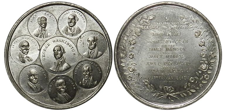 Washington Eight Presidents Medal, c. 1840. White Metal, 46mm. Baker-221D. Rarity-6. Lustrous Unc, a few lt mks, nice cartwheel. Rare this nice.