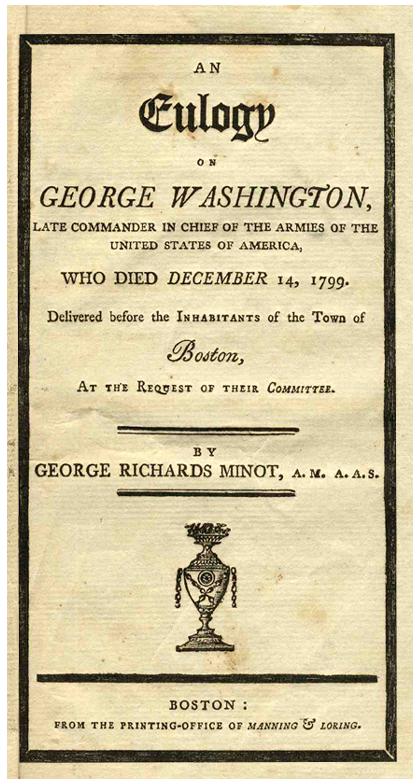 Extremely rare 1st edition published in 1800 by Manning & Loring in Boston. Eulogy in 5'' x 8.5'' book was delivered before the inhabitants of Boston by George Richards Minot, a lawyer and orator. Excerpt: ''…Come, then, Warriors! Citizens! Affemble round the tomb of this favourite fon of virtue…partake of the greatest legacy which a mortal could bequeath you, in the contemplation of his example…Where Liberty was, there would be his country…'' 24pp. Some staining and toning, with small, isolated patches of foxing. Good condition.