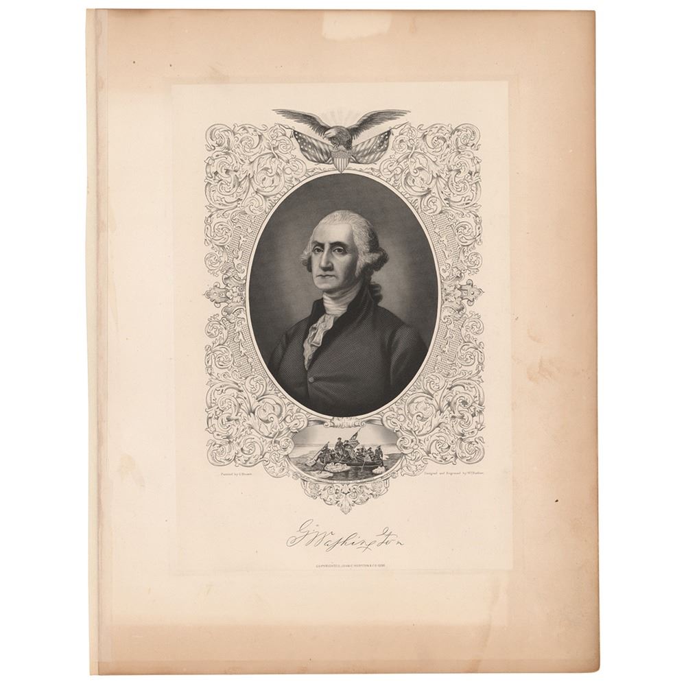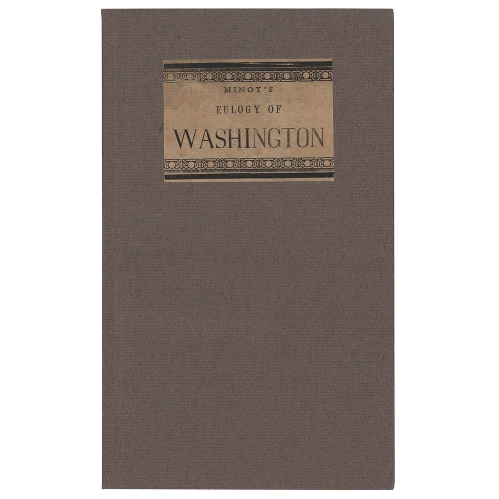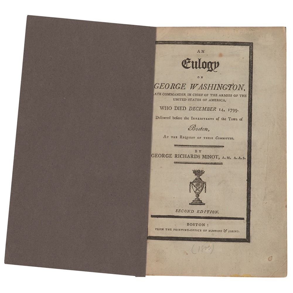 Desirable booklet entitled "An Eulogy on George Washington, late commander in chief of the Armies of the United States of America, who died December 14, 1799, Delivered before the Inhabitants of the Town of Boston, at the Request of their Committee, by George Richards Minot," 24 pages, 5 x 8.25, second edition, printed in 1800 by Manning & Loring. In Minot's rousing eulogy, he extolls Gen. Washington's virtues as a warrior and political figure, concluding: "When such lamps are extinguished, we are happy if our darkness be transient. But in your wisdom the people of our Commonwealth safely confide; nor as members of our united country, do they mourn like those who are without hope; for although in the present gloom of our political hemisphere, their late ruling planet has travelled to the morning of another clime, yet its kindred luminary rises on the horizon, brilliant, steady, and propitious to direct their course. They lament that their beloved Washington sleeps in death; their consolation is, that his faithful Brother, the vigilant Adams, survives." In fine condition. Accompanied by an 11 x 14 engraved portrait of Washington with his facsimile signature, published by John C. Yorston & Co. in 1896.