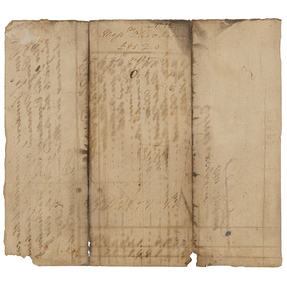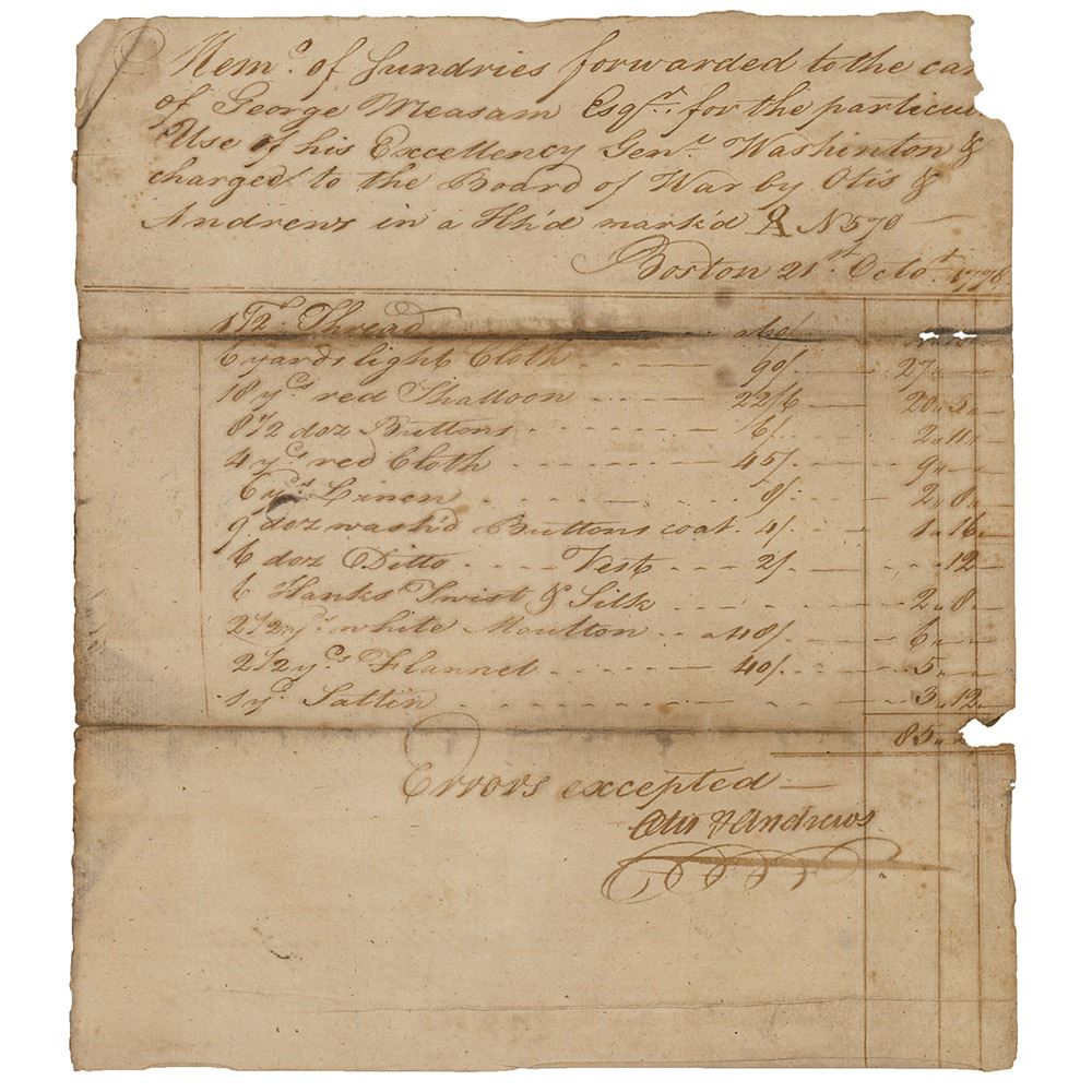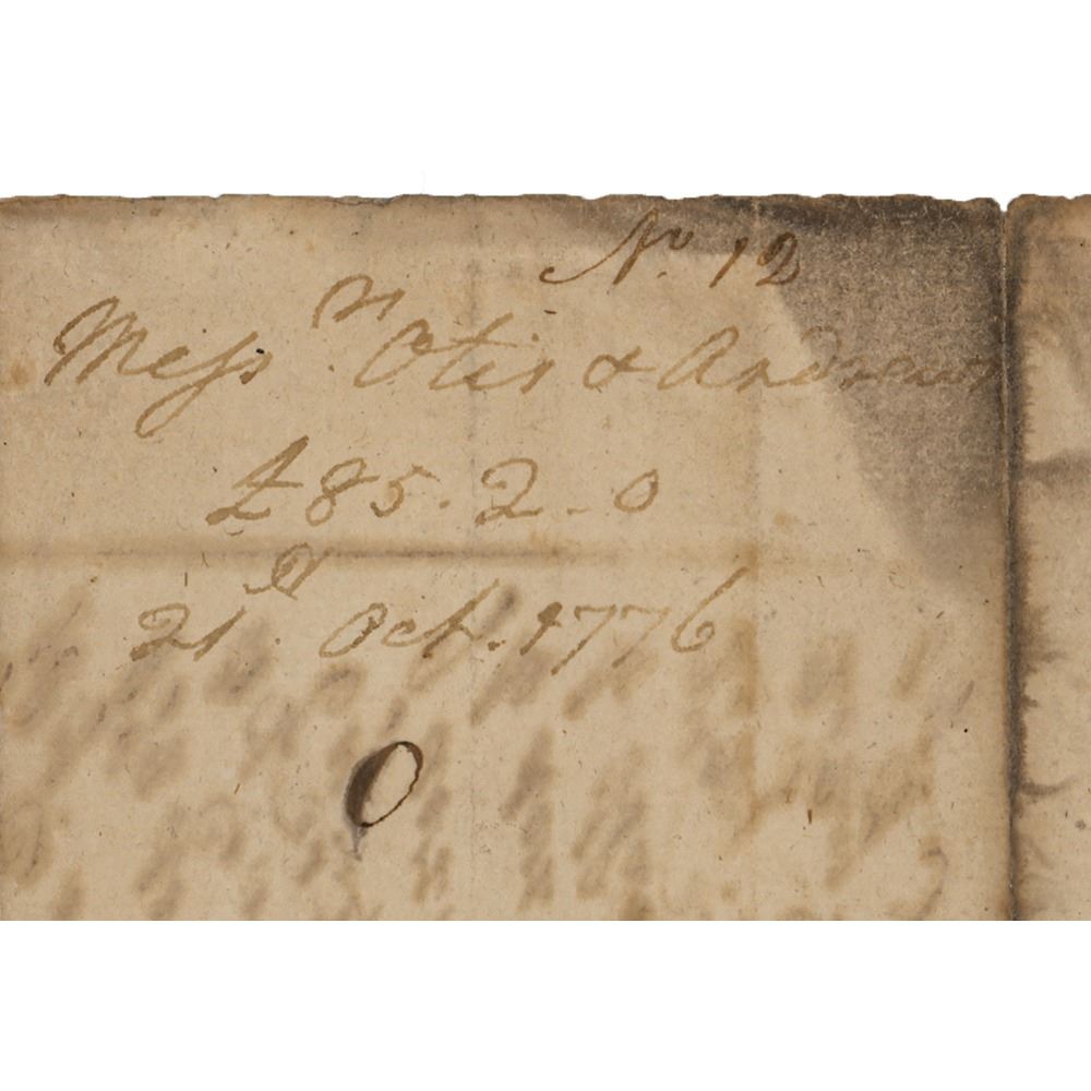 Handwritten docketing by George Washington on the reverse of Revolutionary War–dated document, one page, 7.5 x 8.5, Boston, October 21, 1778, being a list of items for General Washington’s personal use. General Washington dockets the reverse, "Mss Otis & Andrews , £85.20, 21st Oct. 1776 [sic]." The manuscript document's heading reads: “Memo of Sundries forwarded to the care of George Measam, Esq. for the particular use of his Excellency Genl. Washington & charged to the Board of War by Otis & Andrews in a H[og]h’d mark’d AN 570.†In very good condition, with light staining, toning, and small areas of edge loss; Washington's handwriting is quite light, but fully legible.