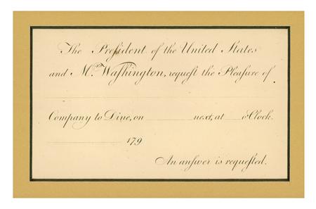 George Washington engraved invitation for dinner at the Presidential residence, likely the mansion rented from Robert Morris at 524 Market Street in Philadelphia, where the Washingtons lived from November 1790 to March 1797. Invitation reads: ''The President of the United States and Mrs. Washington, request the Pleasure of _________ Company to Dine, on ______ next, at ____o'Clock. ______179_ An answer is requested''. Early printed presidential invitations are rather scarce and highly desirable among presidential and political collectors. Measures 6'' x 4''. Tiny spot of foxing affects one letter in first line, else fine condition.