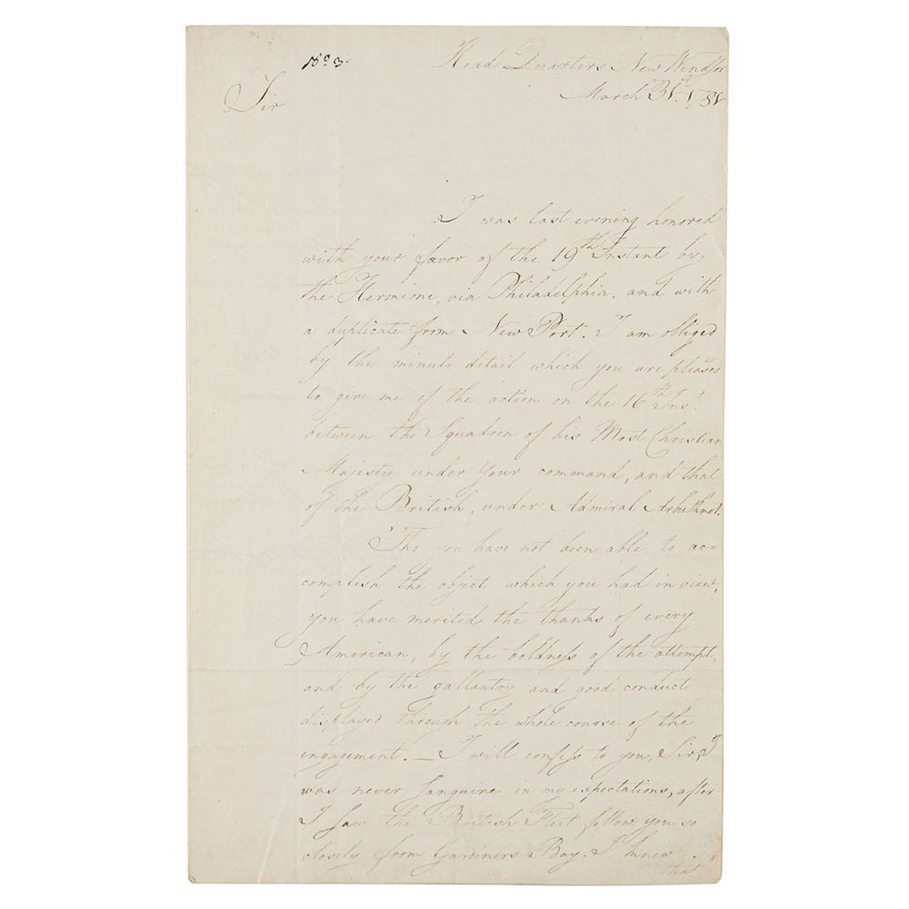 In full: "I was last evening honored with you favor of the 19th Instant by the Hermione, via Philadelphia, and with a duplicate from New Port. I am obliged by the minute detail which you are pleased to give me on the Action of the 16th Inst. between the Squadron of his Most Christian Majesty under your command and that of the British under Admiral Arbuthnot.