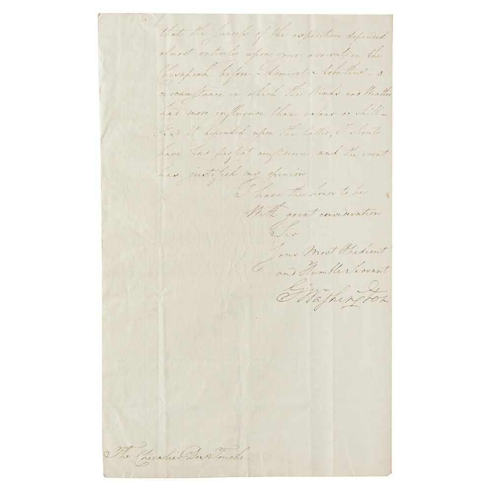 Rochambeau wrote to Washington in protest, explaining the circumstances of any delays and demanding an answer with 'all the candor which distinguishes your Character.' The embarrassed Washington replied graciously regarding the 'intercepted letter of mine published by the enemy,' writing: 'I am unhappy, that an accident should have put it in their power to give to the world any thing from me, which may contain an implication the least disagreeable to you or to the Chevalier Des-Touches.' Washington closed the letter by offering further reassurance of his 'real esteem for, and confidence in the Chevalier Des Touches.' A significant letter of the Revolutionary War era, signed by the general who would soon deliver victory at Yorktown.