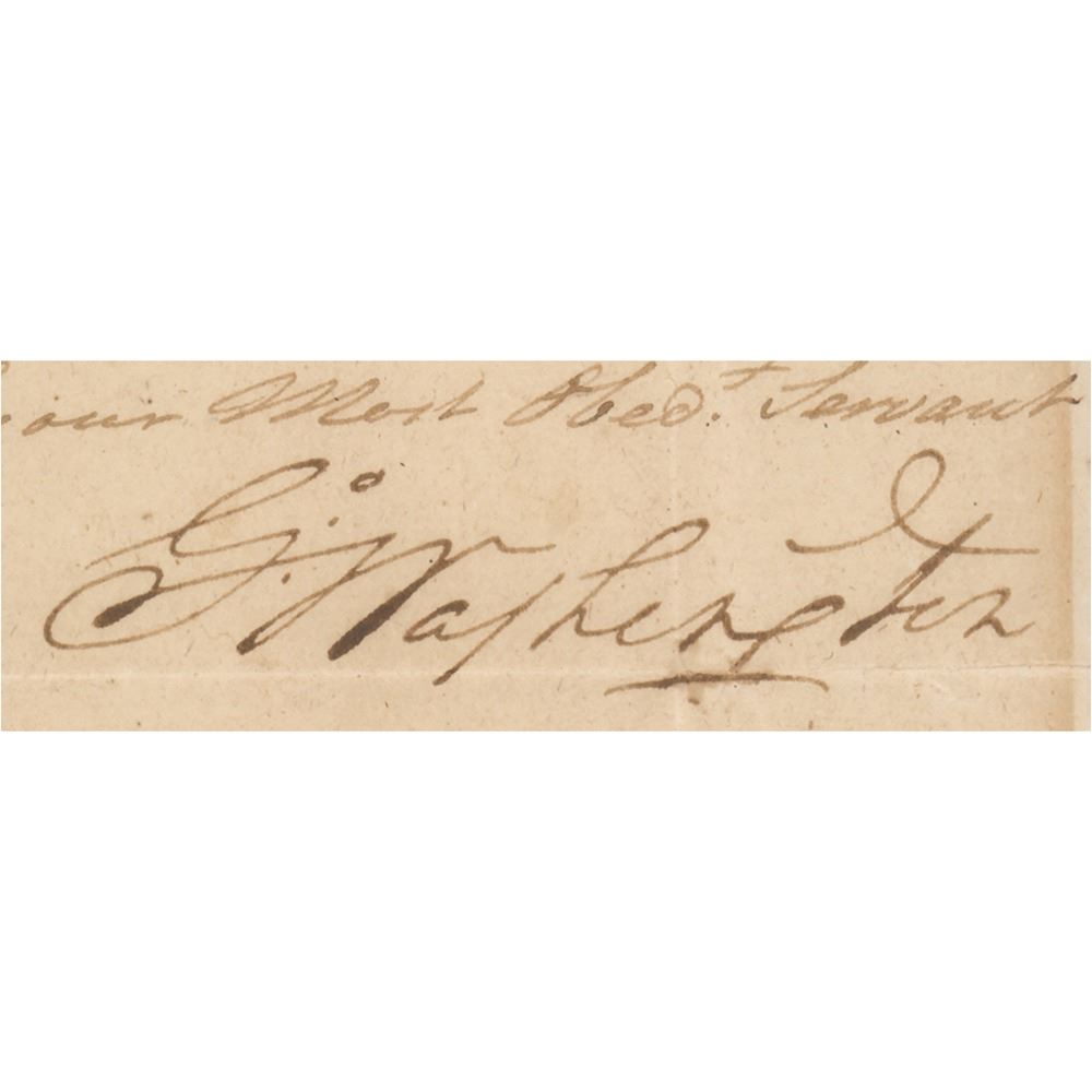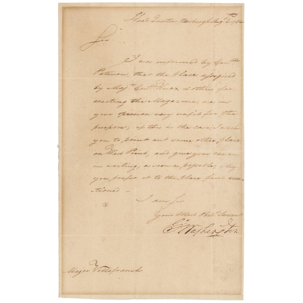 Important war-dated LS, signed "Go: Washington," one page, 7.25 x 11.5, Newburgh, New York, August 6, 1782. Letter to Major Villefranche concerning plans for the French officer to construct a powder magazine at West Point. In full, "I was informed by the Genl. Paterson, that the place assigned by Majr. Genl. Knox & others for erecting the Magazine, was in your opinion very unfit for the purpose; if this is the case, I wish you to point out some other place on West Point, and give your reasons in writing, as soon as possible, why you prefer it to the place first mentioned." In fine condition, with trimmed edges and light toning from prior display.