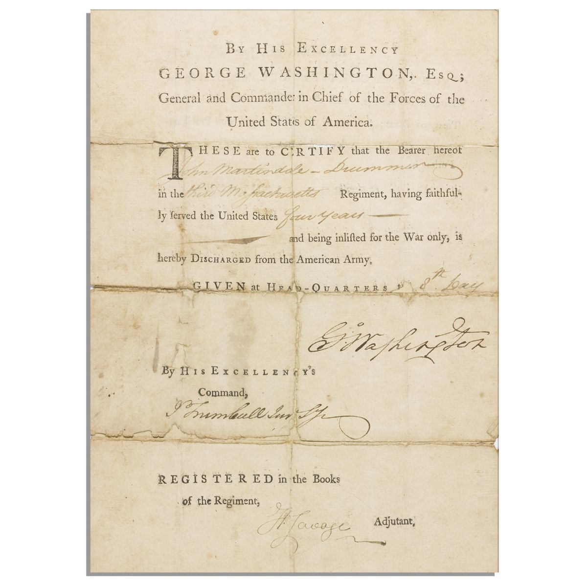 George Washington document signed, ''G Washington'' as Commander of the Continental Army. Document discharges the soldier John Martindale, datelined Headquarters (Newburgh, NY), 8 June 1783. Countersigned by Jonathan Trumbull Jr. and H. Savage. Two page document measures 11'' x 8''. Light scattered staining and an additional half sheet patch on verso, else near fine.
