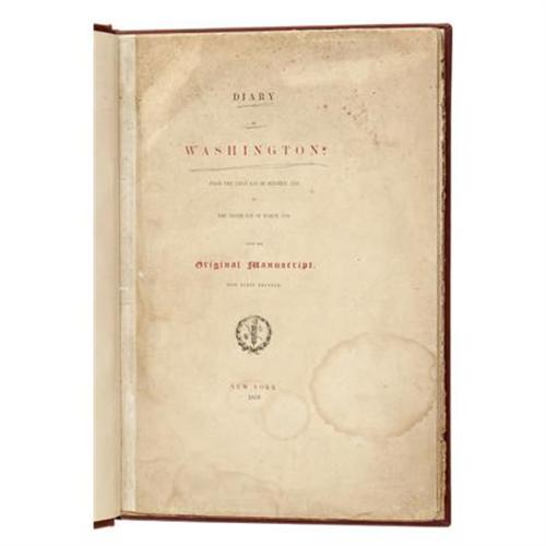 <B>George Washington: Numbered Edition of <I>Diary of Washington: From the First Day of October, 1789, to the Tenth Day of March, 1790</B></I></B></I> <I>from the Original Manuscript, Now First Printed.</B></I> (New York: 1858), privately printed presentation copy, number 40 of 100 copies, 89 pages, modern crimson cloth with gilt lettering on the spine, 4to (7.5" x 10.75"). Very good condition, with age toning to the original text.<BR><BR><b>Shipping:</b> Books & Catalogs (<a target="_blank" href="http://www.heritageauctions.com/common/shipping.php">view shipping information</a>)