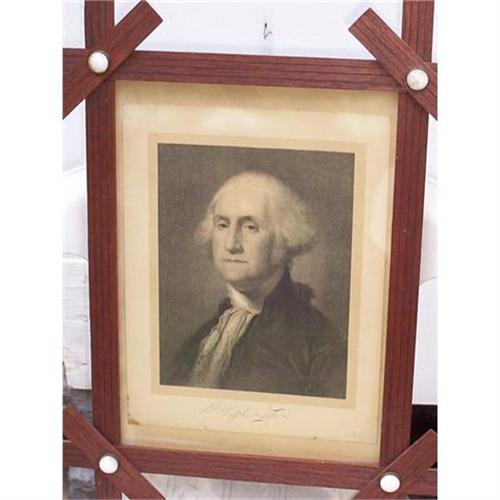 George Washington Portrait, in cross cornered frame. The print is from aproximately 1865 and in fair condition. The frame is in excellent condition and has white porcelain buttons on the corners. There are grooves carved in the ends of the frame which is probably a Pennsylvania piece. If you would like more photos please email.