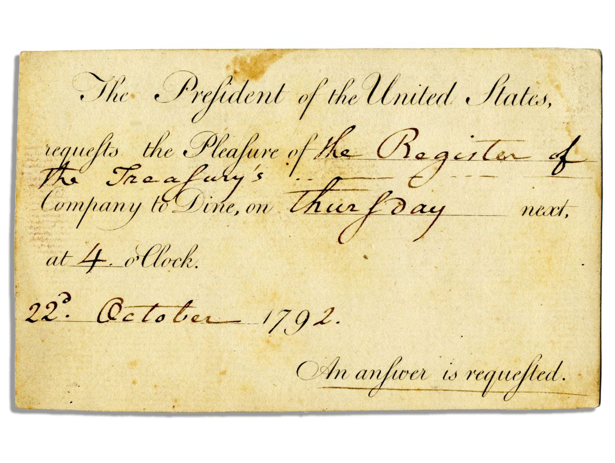 George Washington Presidential invitation to dinner, reading in full: ''The President of the United States requests the Pleasure of the Register of the Treasury's [Joseph Nourse's] company to Dine, on Thursday next at 4 o'clock / 22 October, 1792 / An answer is requested''. Partly printed document measures approximately 4.5'' x 3''. Nourse was the first U.S. Register of the Treasury. According to ''The Papers of Alexander Hamilton'' by Harold C. Syrett, Hamilton had noted that this day concluded with ''...a contract for several articles of Clothing specified'' for United States troops for the year 1793. The dinner meeting that evening with the 1st U.S. Register of the Treasury was probably regarding this same recorded historical event. Toning, slight foxing and minimal glue remnants to verso. Very good condition. Filled out invitations from the Presidency of George Washington are almost unheard of and this is a particularly important example.