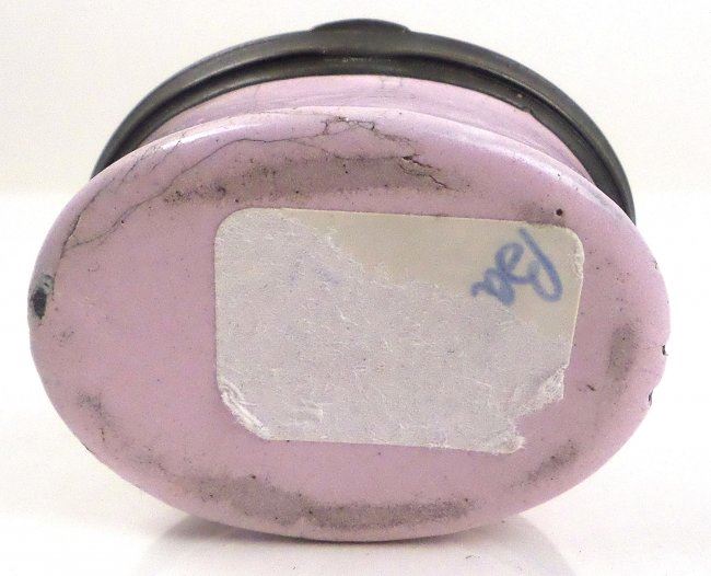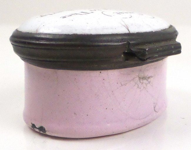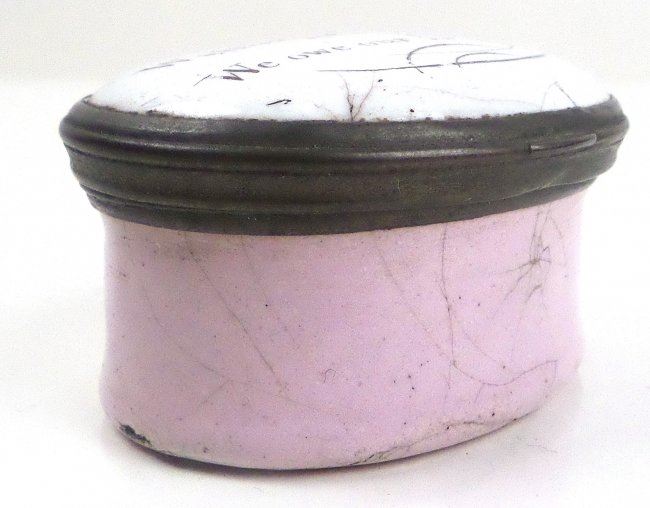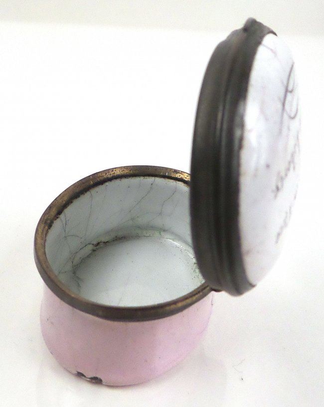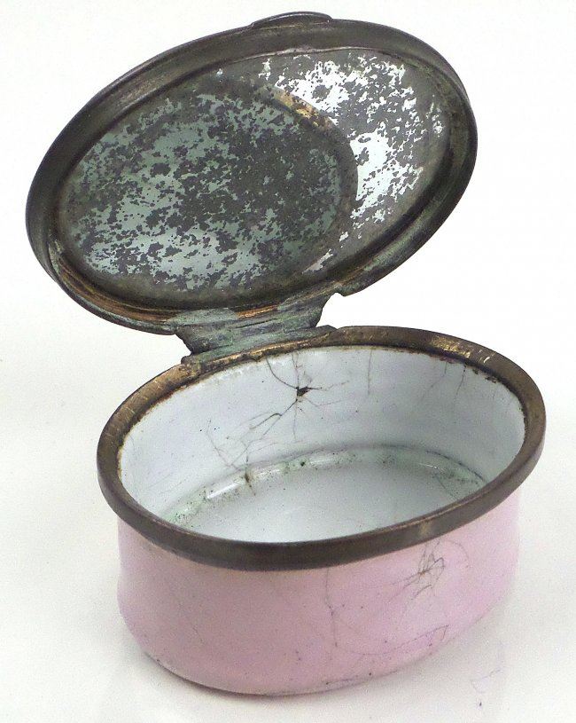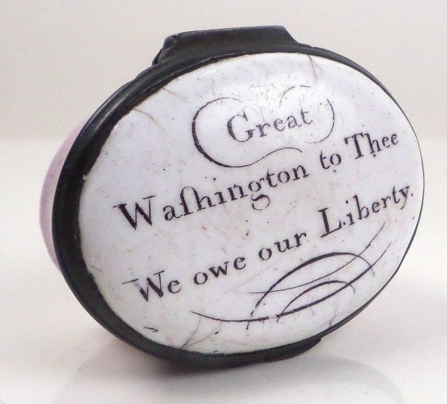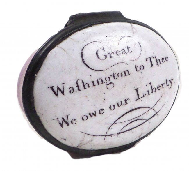 One of very few Battersea enamel specimens destined for the American market with the image of Washington. This variety reading "Great Washington to Thee We Owe Our Liberty" is much rarer than the portrait varieties. Retains original mirrored interior lid. [1-3/4" W x 1-1/4" D x 1"H]. Bears typical short hairline cracks throughout and few small chips at bottom.