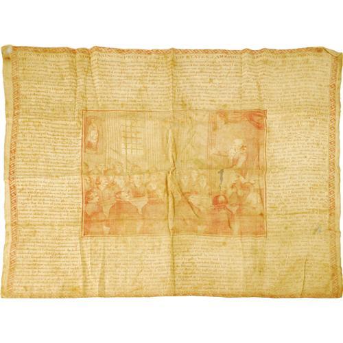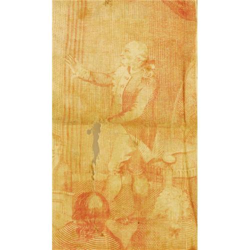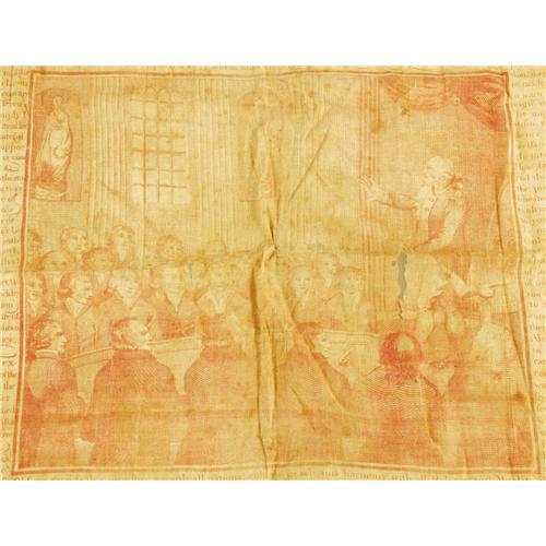 <B>George Washington: An Extremely Rare Contemporary Bordered Bandana.</B></I> This large cotton bandana, circa late 1790s, depicts Washington addressing the congress, giving his famous Farewell Address. The title at the top reads 'Washington addressing the people of the United States of American on his resignation from the presidency", and the central image is surrounded by the text of that speech. We have never encountered this particular variety before, and consider it vastly more important than the several more familiar varieties of similar-appearing textiles mourning Washington's death. <BR><BR>This textile has never had the benefit of professional conservation and such attention would greatly improve its display appearance, which is basically sound. The background has typically aged to an even beige tone, and the red printing has faded evenly somewhat, but not to a serious degree. There is a surprising lack of significant soiling or staining, although scattered light indications of "aging" are present. The bandana still has the fold lines from some two centuries of storage in a folded form, and a professional pressing would make it much easier to appreciate the design and appearance. There are two minor holes, one at the upper left hand corner, and one near the right edge toward the bottom. There is a somewhat larger hole near the center. Fortunately it is not on any significant design element, but rather an area of the backdrop behind Washington's figure. Professional re-backing with a color consistent with the overall beige tones would render this hole hardly noticeable. While certainly display-worthy in its present state, this significant early Washington textile deserves to find a buyer who will bring out its full display potential. Dimensions: 24" x 22".<BR><BR><b>Shipping:</b> Small Collectibles (<a target="_blank" href="http://www.heritageauctions.com/common/shipping.php">view shipping information</a>)