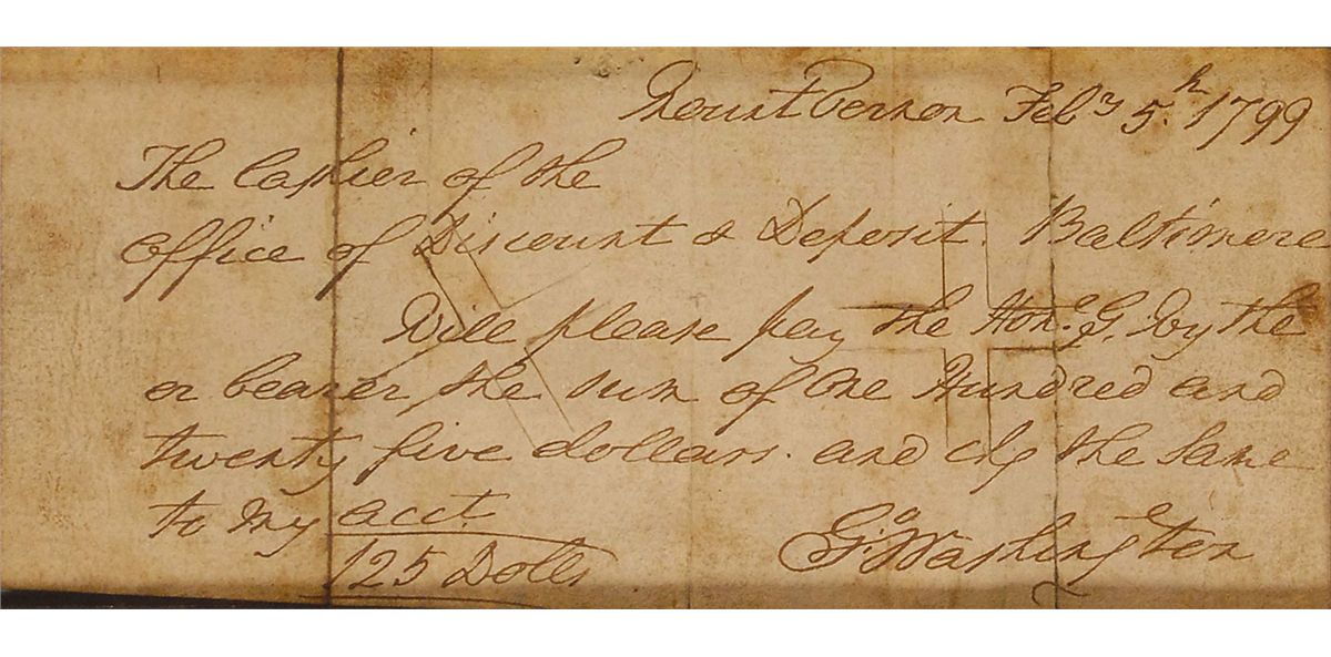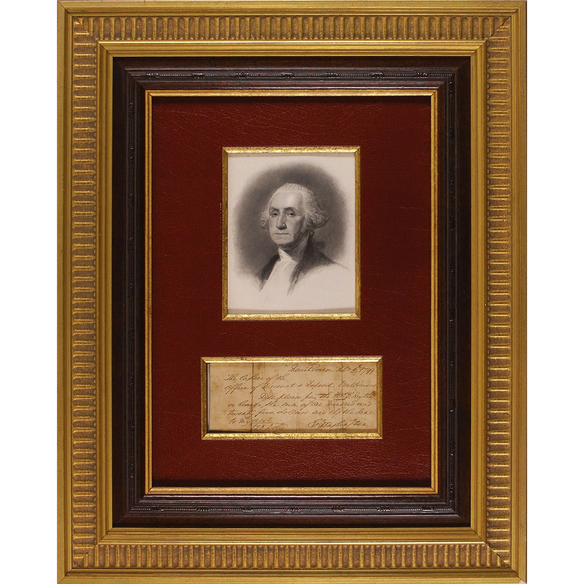 An original Robert Spring forgery of a George Washington check, signed “Go: Washington,” 6 x 2.5, ordering the cashier of the Office of Discount and Deposit in Baltimore to pay the bearer $125.00. Elaborately and archivally double-cloth-matted and framed, so both sides may be viewed, with a portrait of Washington to an overall size of 17 x 21. In very good condition, with expected cancellation cuts to body, three vertical folds, and moderate soiling. The English-born Spring forged letters and documents from luminaries including Washington, Benjamin Franklin, and Horatio Nelson. This example serves as the ideal ‘place holder’ in a collection until a scarce, authentic Washington piece can be secured!