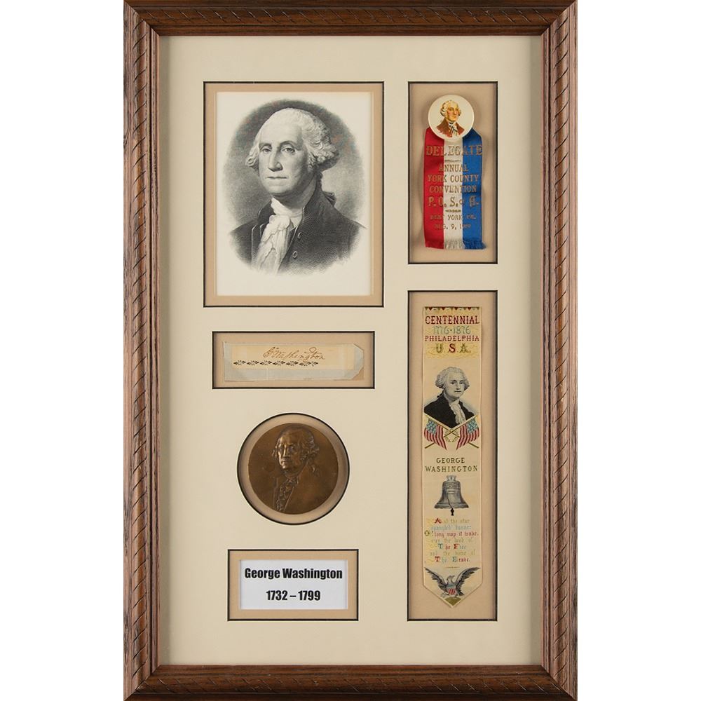Crisp ink signature, "Go: Washington,” on an off-white 3.25 x .75 sheet clipped from a 1768 ticket for the 'Mountain Road Lottery.' Archivally mounted, matted, and framed with an engraving, medallion, caption, and two patriotic ribbons to an overall size of 12.5 x 19.25; reverse of frame contains a printed copy of the lottery ticket. In fine condition.