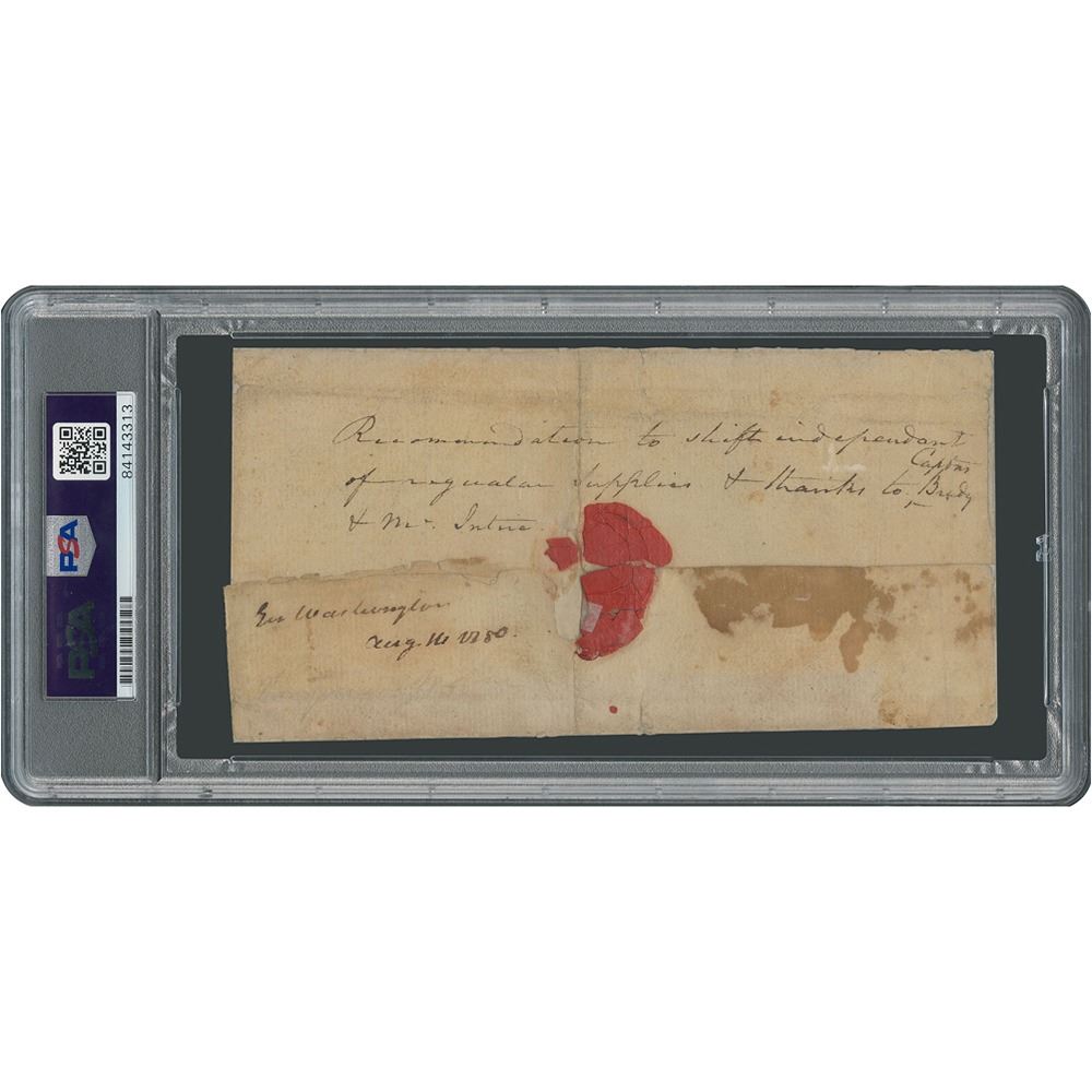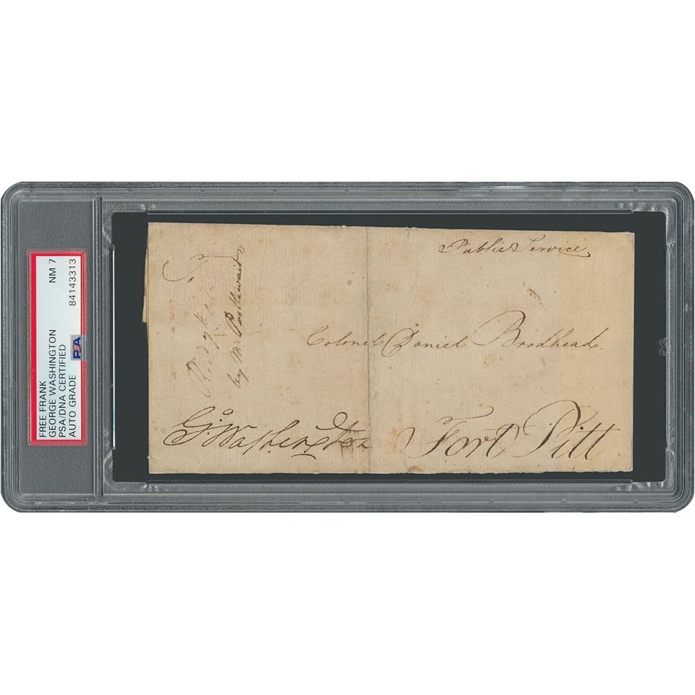 Extremely desirable Revolutionary War–era free-franked address panel, 6.75 x 3.5, addressed in another hand to "Colonel Daniel Brod[head]" at "Fort P[itt]," and beautifully franked in the lower left, "G:o Washington." Marked "Public Serv[ice]" in the upper left, and annotated vertically on the left side in ink, "Rec'd 7th Oct'r by Mr. Postlewaite." In very good to fine condition, with intersecting folds, light overall soiling, and scratching to the top of the frame. Encapsulated in a PSA/DNA authentication holder.
