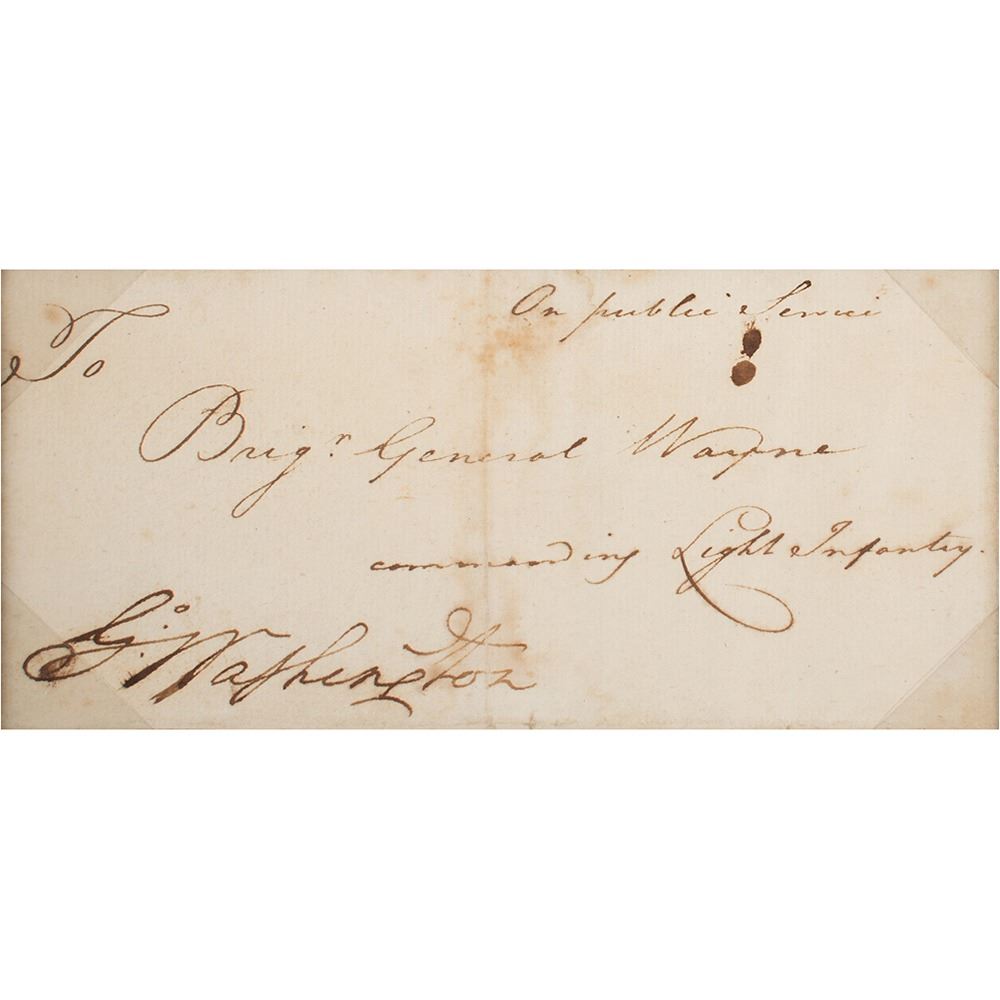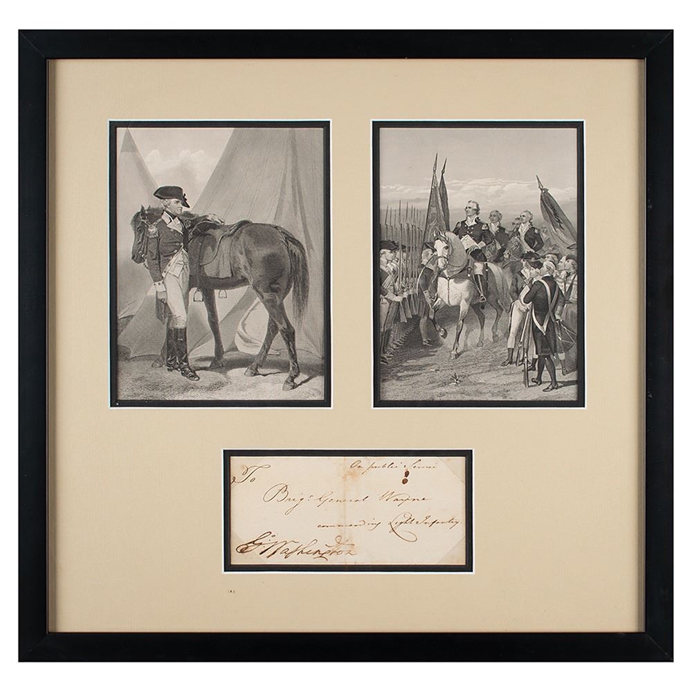 Desirable free frank, 6.25 x 2.75, addressed in another hand to "On Public Service, Brig'r General Wayne, commanding Light Infantry," and franked in the lower left, "Go: Washington." Double-matted and framed with engravings to an overall size of 17.5 x 17. In fine condition, with light staining along the central vertical fold.