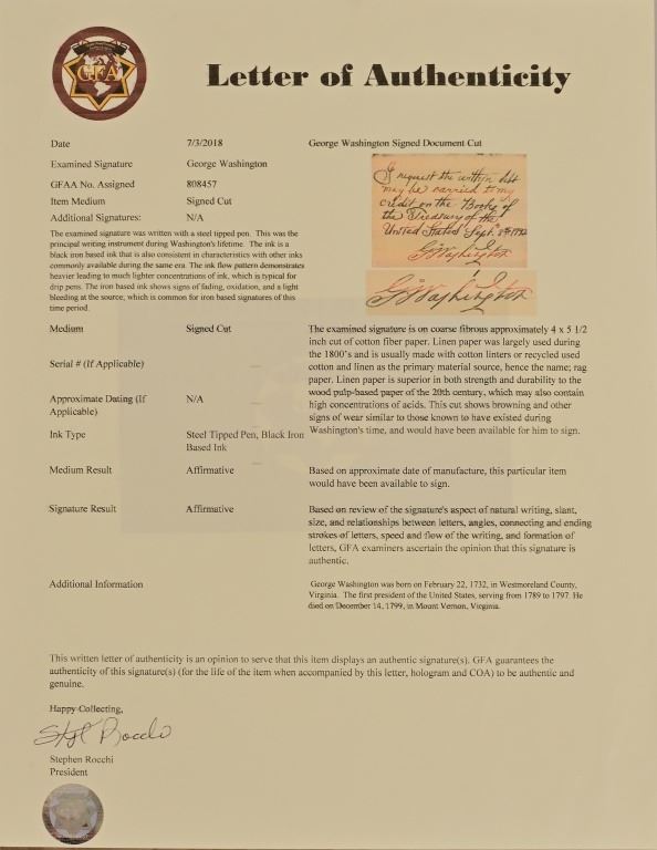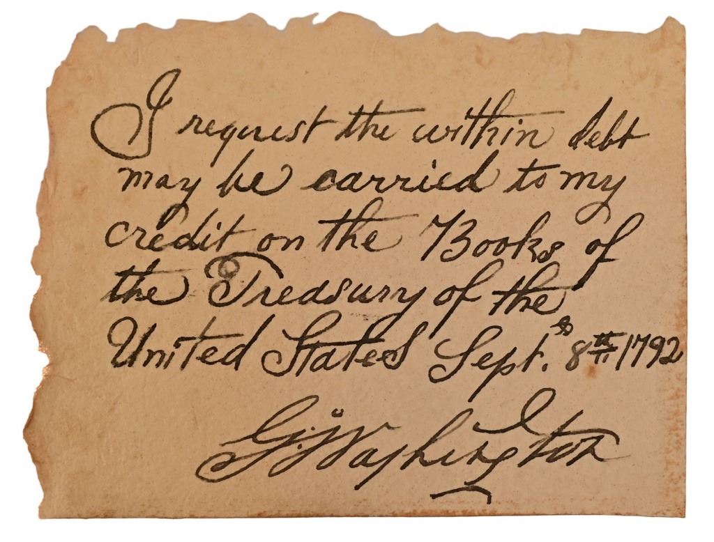 George Washington signed note. GFA authenticated. 4x5 inches. FL124