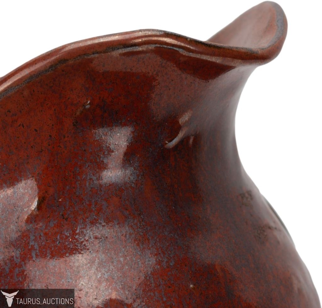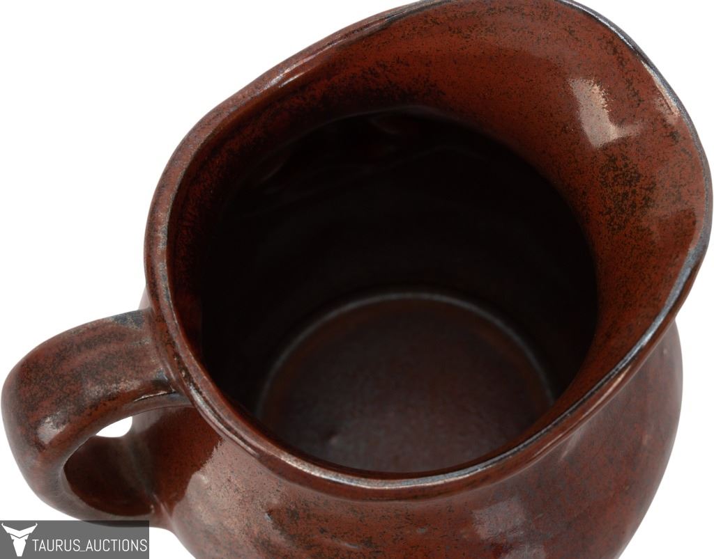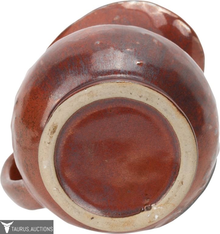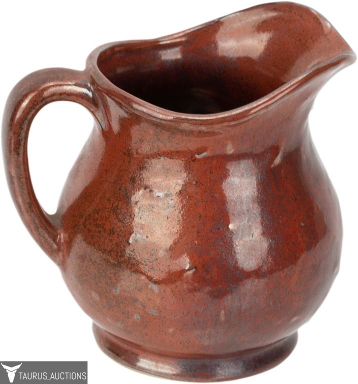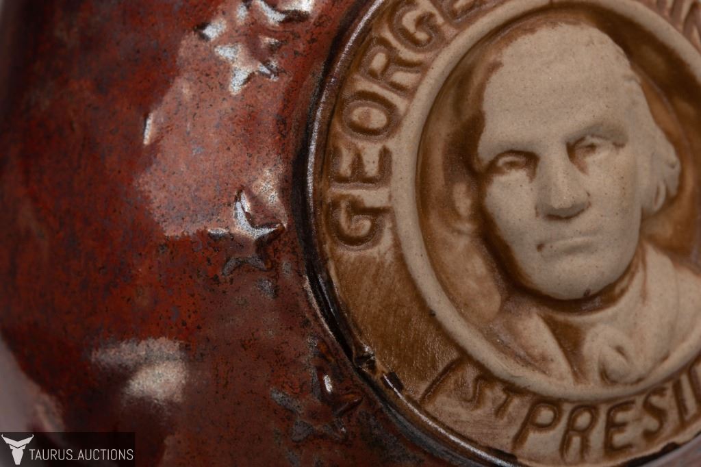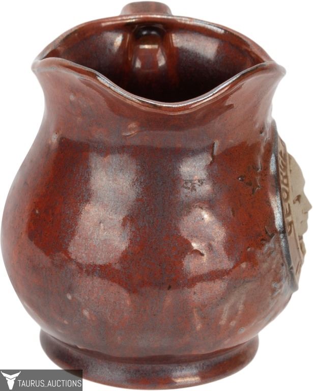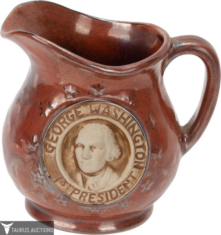 Item/Description: Small brown glazed stoneware creamer pitcher features an unglazed cameo bust image of "George Washington 1st President". Unknown artist, no noticeable makers marks.
