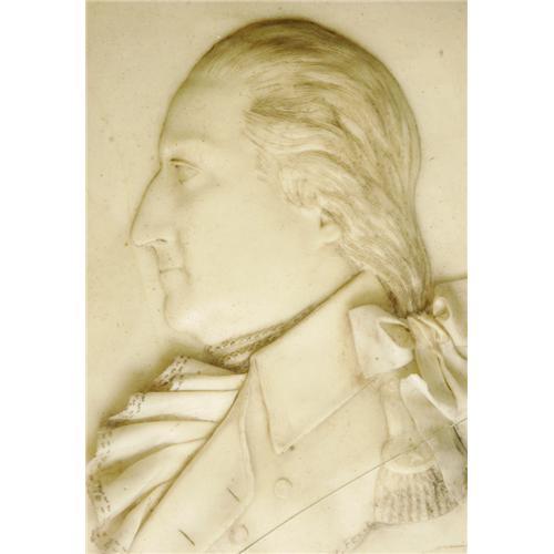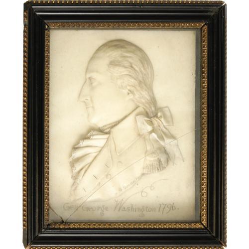 <B>George Washington Wax Panel Signed "G. Rouse",</B></I> 8" x 10" sight size in 10.75" x 12.5" shadow frame. A magnificent and completely realistic lifetime profile portrait of Washington facing left in uniform. "Gen George Washington 1796" is inscribed below the bust. This elegant English product simulates fine polished marble. Two cracks in the frame's glass, else excellent condition. Three-dimensional Washington items which can definitely be dated to his presidency are quite rare. This high-relief portrait almost qualifies as a sculpture and has superb display presence. The original glass could be replaced.<BR><BR><b>Shipping:</b> Miscellaneous Collectibles, Smal (<a target="_blank" href="http://www.heritageauctions.com/common/shipping.php">view shipping information</a>)
