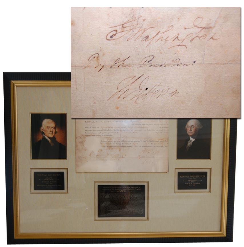 George Washington as the First President and Thomas Jefferson as the first Secretary of State document signed ''G:Washington'' and ''By the President/Th:Jefferson'', dated 8 March 1792. Document appoints a William Lewis as an Inspector of the Revenue, one of 104 nominated as part of the U.S. Customs Service. The service was comprised of three positions: the Collector of the Port of Entry, the Naval Officer of the Point of Entry, and the Surveyors of the Port of Entry. Lewis was appointed the first, Collector of the Port of Entry. Most of these appointments were rewards given for service during the Revolutionary War. Partly printed document reads: ''Know Ye, That reposing special Trust and Confidence in the Integrity, Diligence and Discretion of William Lewis, of Virginia, I have nominated, and by and with the Advice and Consent of the Senate, Do appoint him Inspector of the Revue for the Port of Fredericksburg, and do authorize and empower him to execute and fulfil the Duties of that Office according to Law; and to have and to hold the said Office, with all the Rights and Emoluments thereunto legally appertaining, unto him the said William Lewis, during the Pleasure of the President of the United States for the Time Being.'' Document, measuring 15.75'' x 12.5'', has been archivally repaired on verso with conservator's paper reattached to folds that had caused tearing, though not affecting signatures. Official seal is missing, causing a 3'' hole and thus removing some of the printed words. Overall in very good condition. Document is framed with two portrait engravings and commemorative plaques of Washington and Jefferson.
