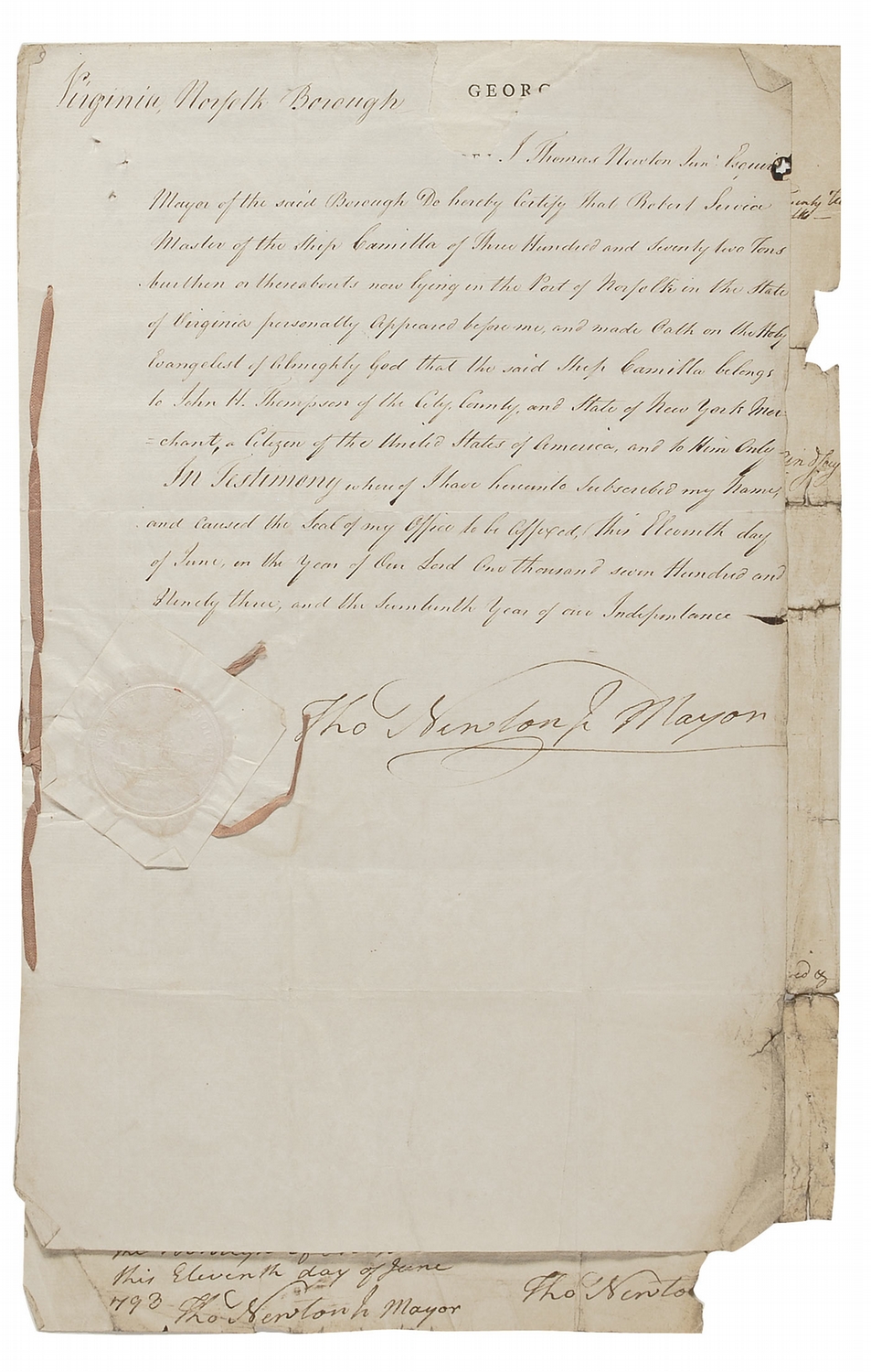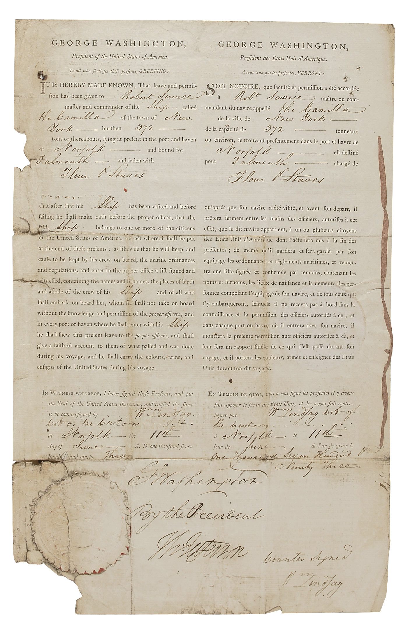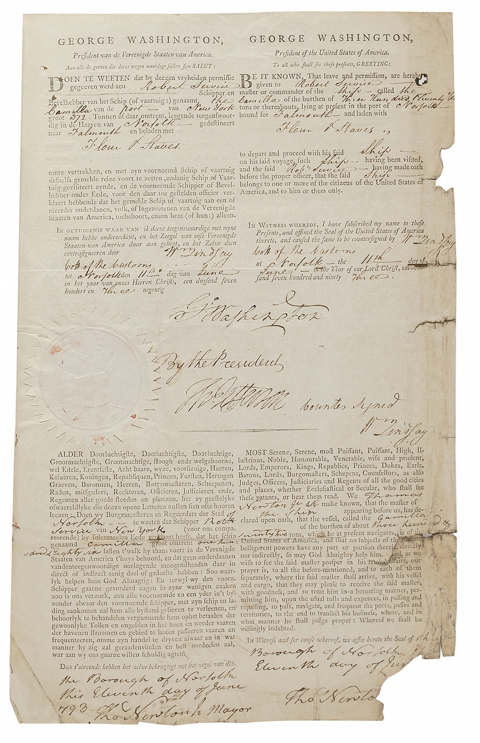 Scarce and desirable partly-printed double-signed DS, signed twice as president, “Go: Washington,” and twice “Th: Jefferson” as secretary of state, one page both sides, 10 x 15.5, June 11, 1793. Three language ship’s paper, with Dutch and English on one side, and English and French on the reverse, issued to “Robert Service, master and commander of the Ship called the Camilla of the town of New York…lying at present in the port and haven of Norfolk and bound for Falmouth and laden with Flour & Staves that after this Ship has been visited and before sailing he shall make oath before the proper officer, that the said Ship belongs to one or more of the citizens of the United States of America, the act whereof shall be put at the end of the presents; and likewise that he will keep and cause to be kept by his crew on board, the marine ordinances and regulations, and enter into the proper office a list signed and witnessed, containing the names and sirnames, the places of birth, and the abode of the crew of this Ship, and all who shall embark on board her.” Signed on each side, “Go: Washington,” and “Th: Jefferson.” Affixed to the document by its original ribbon is the oath of Norfolk mayor Thomas Newton attesting to the ship and its cargo. In generally very good condition, with paper loss and tears to edges, intersecting folds, scattered toning and soiling, several tack holes, and light creasing and wrinkling. One of the white wafer seals remains crisp and intact, with another one soiled and cracked, but mostly intact. All writing is bold and the signatures, particularly those on the front, are large and quite remarkable.