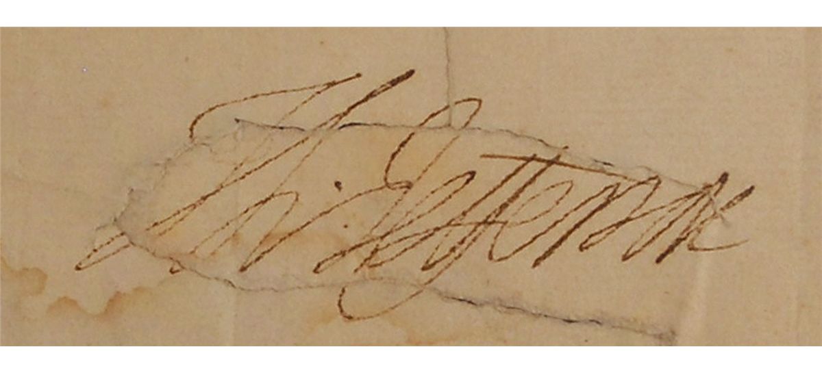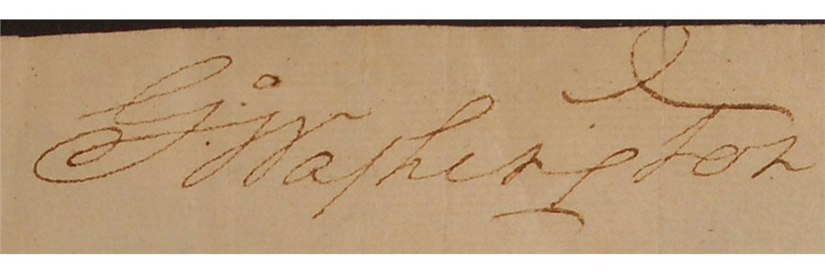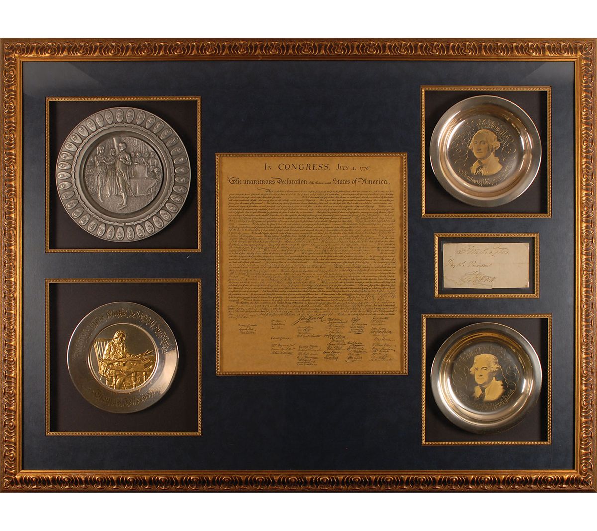 Large ink signatures, “Go: Washington,” as president, and “Th: Jefferson,” as secretary of state, on an off-white 6 x 3.25 portion taken from a larger document. Written between the signatures, in a secretarial hand, is “By the President.” Grandly matted and framed with a copy of the Declaration of Independence and four large commemorative plates to an overall size of 43 x 33. Intersecting folds, passing through a couple letters of each signature, a professional repair to a semi-circular separation through top and bottom portions of Jefferson’s signature, and dampstaining along bottom edge, lightly affecting Jefferson’s signature as well, otherwise very good condition. While documents signed by both become available from time to time, amazingly, in the past 40 years, only a scant handful of Washington/Jefferson signed slips have appeared at major public auctions. Oversized.