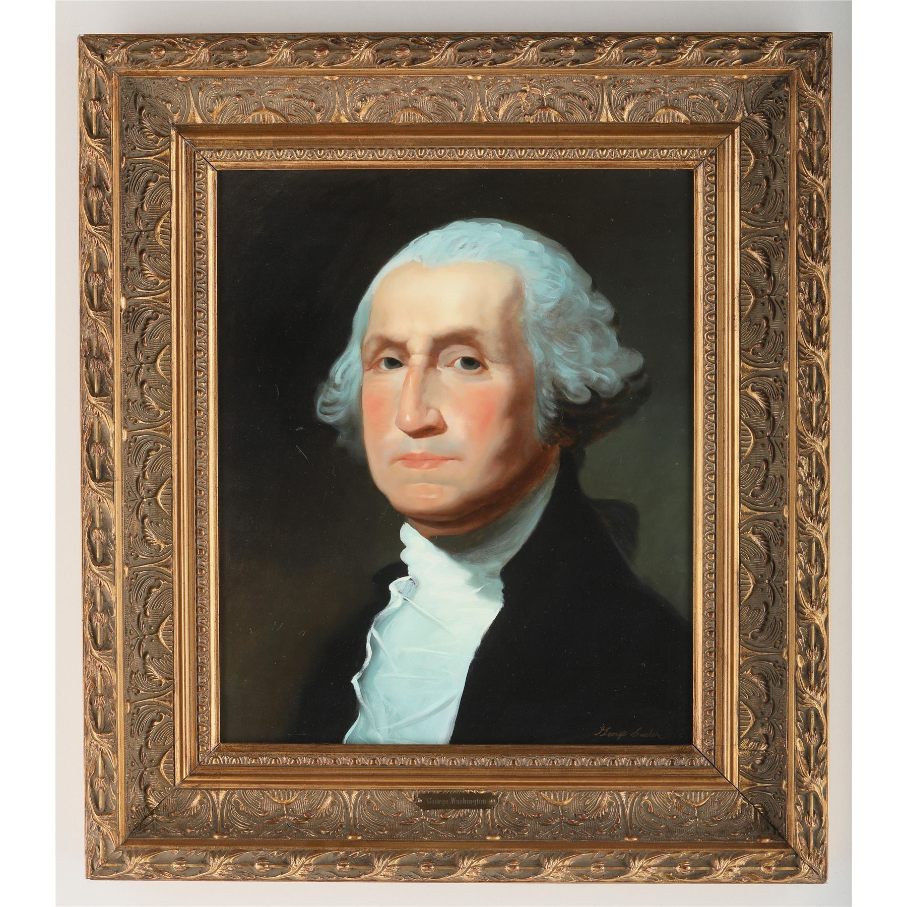 A picture of George Washington on giclee canvas. This piece has beautifully done with exceptional detail, and has been professionally custom framed in an exquisite frame. Image- 23 1/2" x 19 1/2". Frame- 34 1/4" x 30 1/4".
