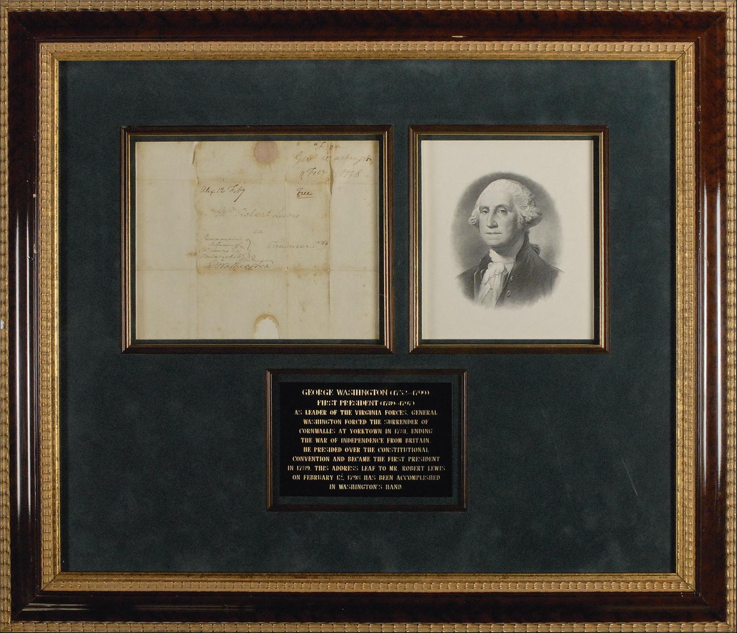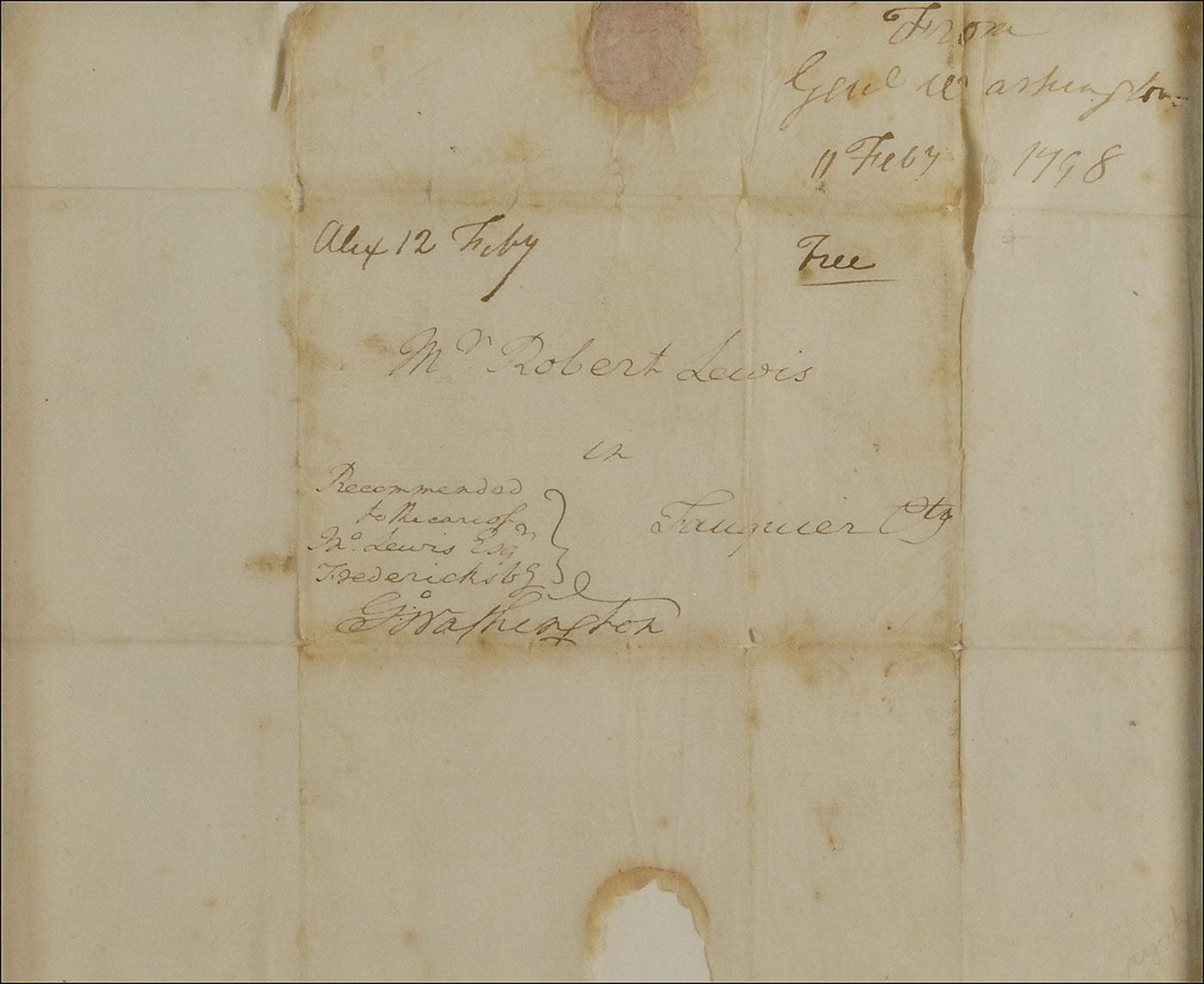 Full free frank, measuring 8.25 x 7 unfolded, with franked panel measuring 4.5 x 3., addressed in Washington’s hand to “Mr. Robert Lewis in Fauquier Cty,” and franked in the lower left of the panel “Go: Washington.” Above his signature, Washington has penned: “Recommended to the care of Jno. Lewis Esq Fredericksbg.” Manuscript postal markings along top read “Alex 12 Feby Free” and docket at the top, probably by Lewis reads, “From Genl Washington 11 Feby 1798.” Attractively double suede matted and framed with a bust portrait engraving of Washington and a biographical plaque to an overall size of 26 x 22.25. In very good condition, with vertical fold through address, scattered toning and soiling, some lightly affecting Washington’s signature, paper loss from seal at bottom, paper loss along a couple of folds, and mild creasing.