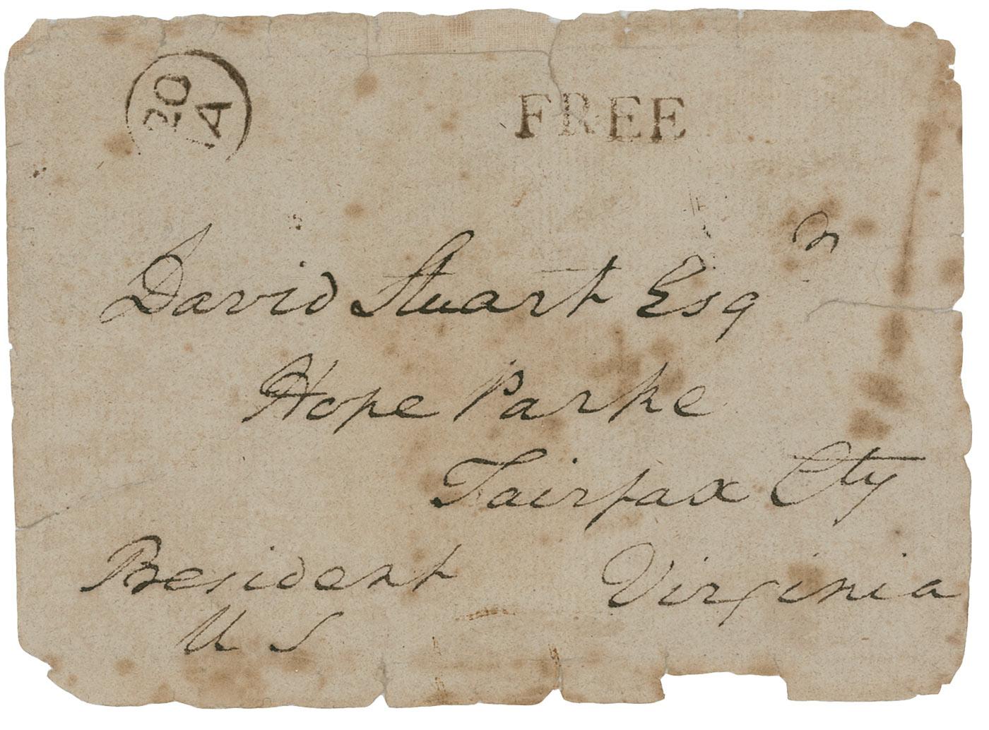 Hand-addressed and free franked mailing panel, as president, 4.75 x 3.5, addressed by Washington to “David Stuart Esq., Hope Parke, Fairfax Cty, Virginia,” and franked in the lower left, “President US.” Panel has been professionally silked on the reverse. Aforementioned silking, several small edge separations and areas of edge loss, and uniform toning with some scattered areas of heavier foxing and staining, otherwise very good condition. Despite the flaws, Washington’s writing remains quite crisp and bold. Stuart purchased his Hope Park plantation in 1785, and was appointed by president Washington, as the Virginia representative on the first board of Commissioners of the Federal City.
