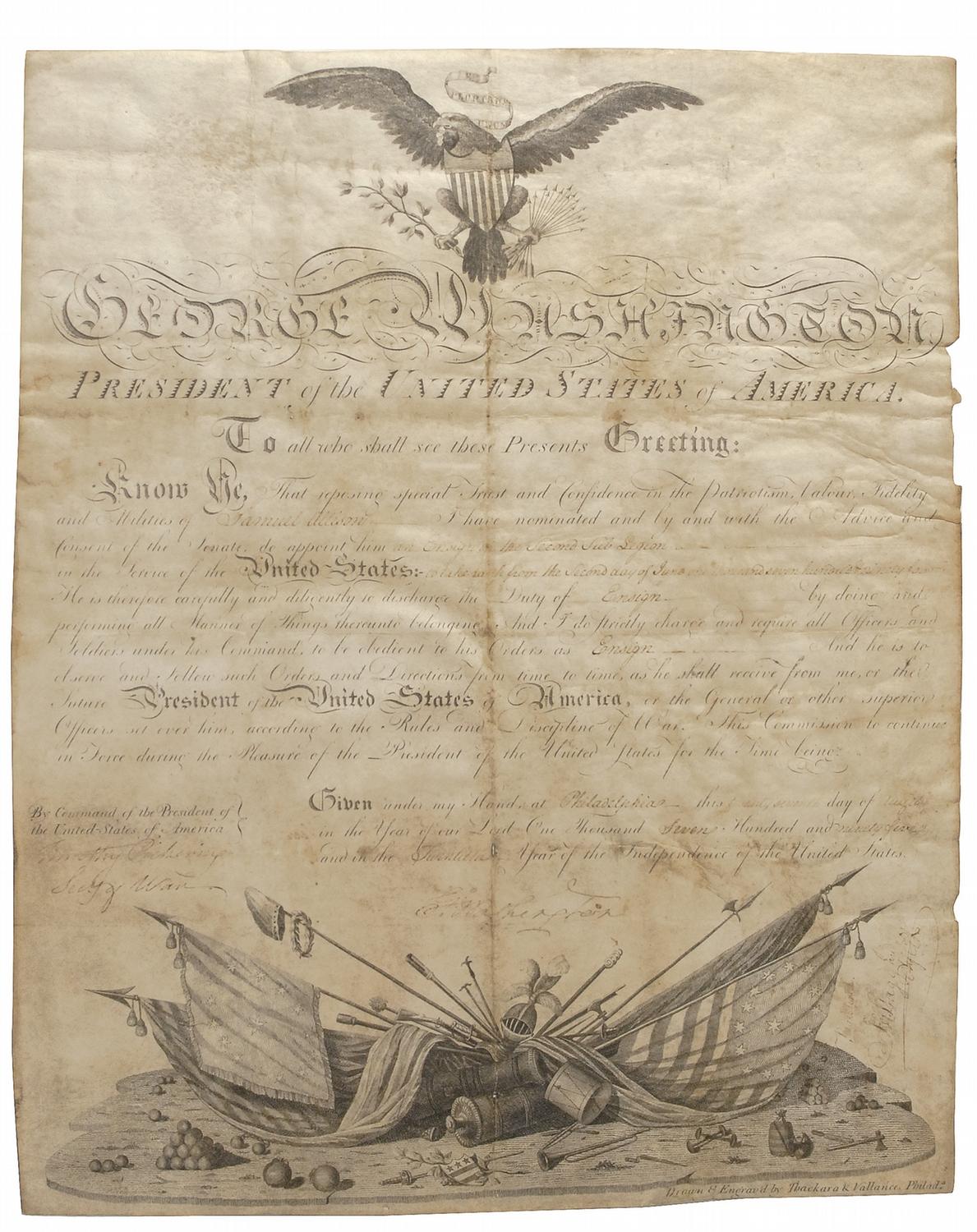Ornate partly-printed vellum DS, signed “Go: Washington,” one page, 15 x 18.5, August 27, 1795. President Washington appoints Samuel Allison “an Ensign in the Second Sub Legion.” Signed at the conclusion by Washington, and countersigned by Secretary of War Timothy Pickering. In good to very good condition, with intersecting folds, one through a single letter of signature, scattered moderate toning and soiling, some lightly affecting Washington’s signature, both signatures a few shades light, but still legible, chipping to edges, wrinkling and rippling from moisture exposure, and partial mounting remnants to reverse.