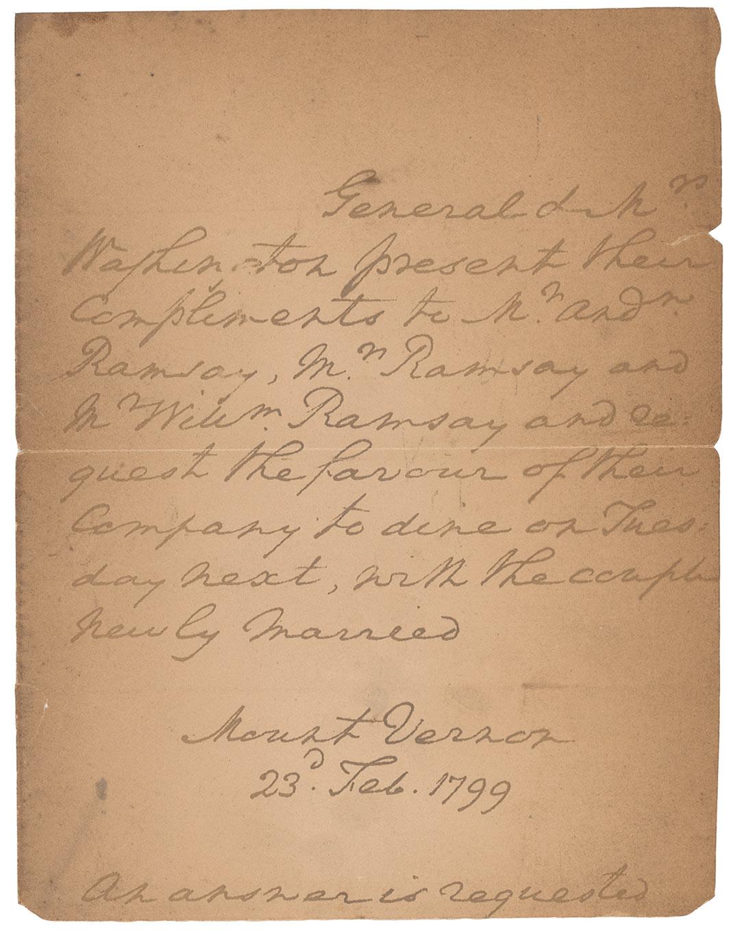 Third-person ALS, one page, 4.5 x 5.75, February 23, 1799. In full: “General and Mrs. Washington present their compliments to Mr Andw. Ramsay, Mrs. Ramsay and Mr Willm Ramsay and request the favour of their company to dine on Tuesday next, with the couple newly married. Mount Vernon. An answer is requested.” Expertly reinforced in two spots on the reverse and in very good condition, with horizontal folds, edge chipping, moderate toning (heavier at edges), and scattered soiling. Accompanied by the front panel, 4.5 x 3, addressed by Washington to “Mr. and Mrs. Ramsay &c in Alexandria.”