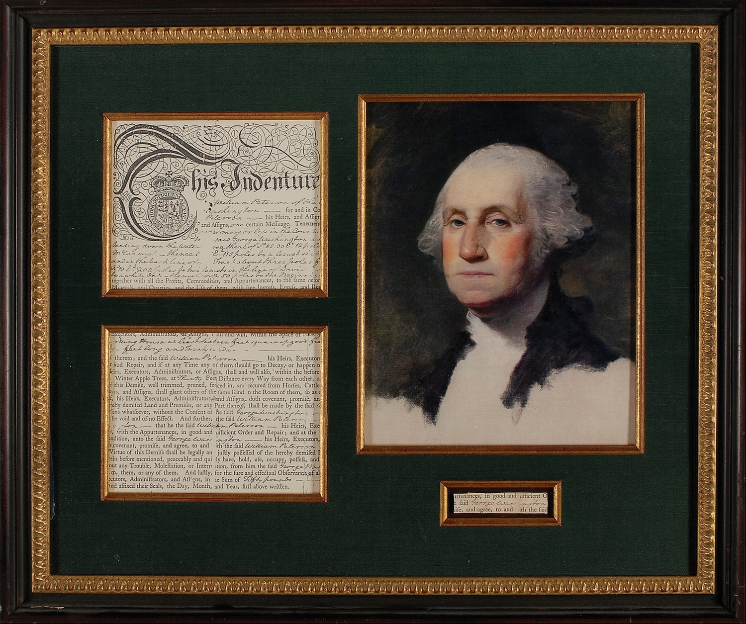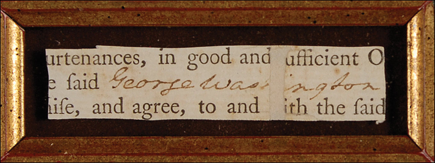 Crisp ink signature, “George Was[hi]ngton,” on an off-white 2.5 x 1 slip, clipped from a larger document. Attractively cloth matted and framed with a copy of two portions of the document showing where the signature appears in the document, as well as a color portrait of Washington, to an overall size of 20 x 17. Professional vertical repair to slip, resulting in the removal of the “hi” of signature, and some scattered light toning, otherwise fine condition. Such complete Washington signatures are seldom seen.
