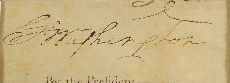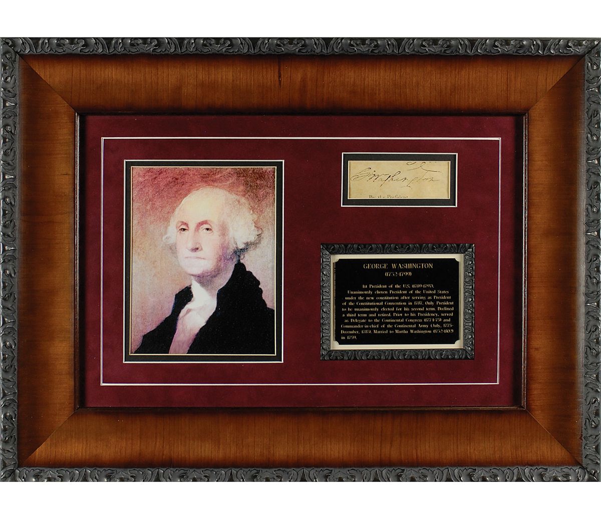 Ink signature, as president, “Go: Washington,” on an off-white 4 x 1.5 slip, clipped from a larger document. Double suede matted and framed with a portrait and a biographical plaque to an overall size of 24 x 18. Light skipping to ink, last few letters of signature a shade or two lighter than the others due to decreased ink flow, and scattered light toning, otherwise fine condition. A large and presentable example ready for display.