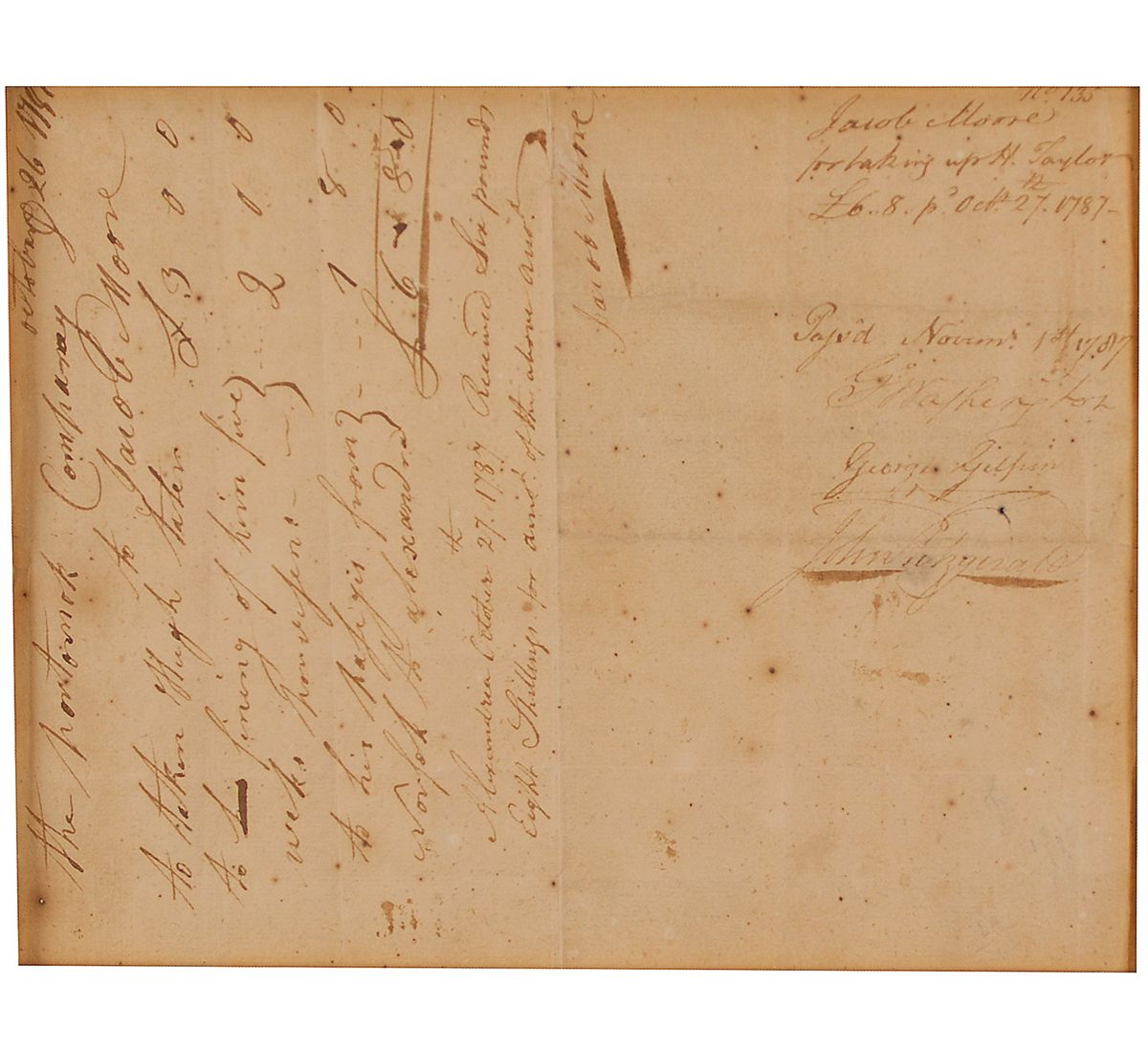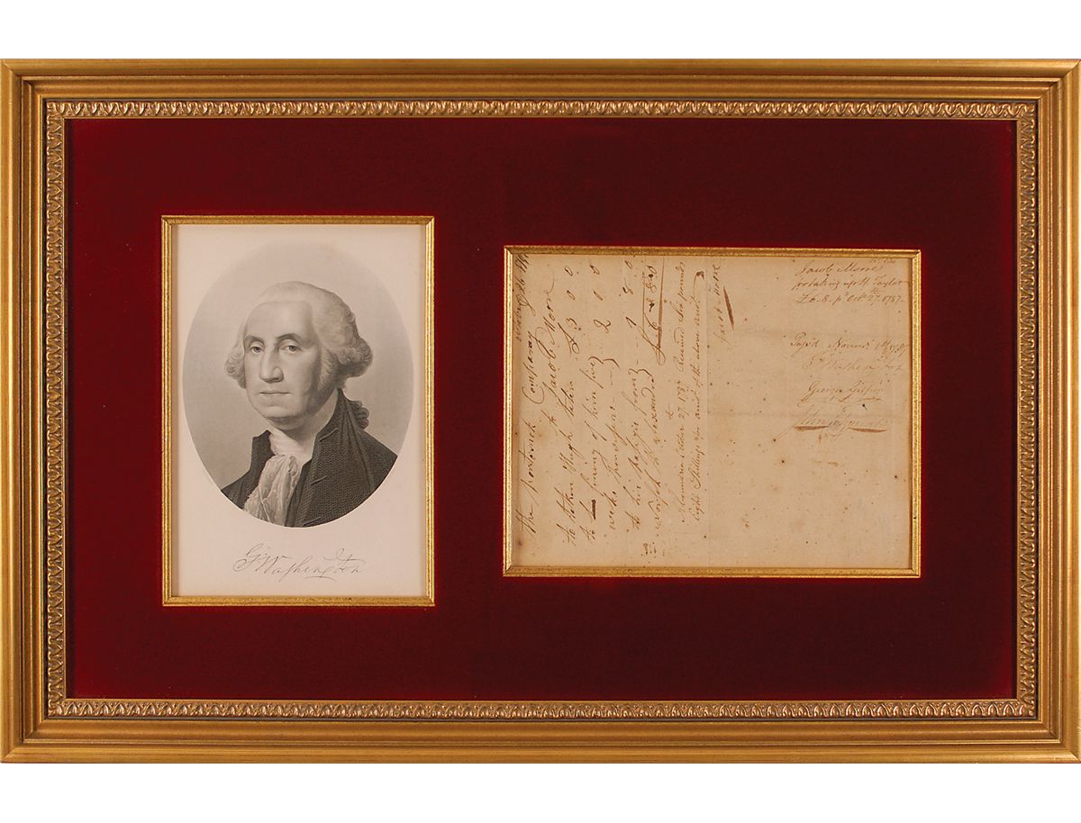 Endorsement signed, “Go: Washington,” as president of the Potomack Company, and also signed by “George Gilpin” and “John Fitzgerald” as directors, dated in another hand November 1, 1787, at the conclusion of a manuscript document, 8.75 x 7, signed by Jacob Moore. The document reads, in full (with grammar and spelling retained): “October 26, 1787, the Portomok Companay. To Jacob Moore to taken Hugh Taler £3.0.0. to fining of him five weks porvisens} 2.0.0 to his passgis from Norfolk to Alexandra} 1 8 0 / £ 6- 8 0.” In another hand underneath is written: “Alexandria October 27th 1787. Received Six pounds Eight Shillings for amt of the above acct.” signed “Jacob Moore.” Perpendicular to this bill and receipt is docketed in unknown hand “Jacob Moore for taking up H. Taylor £6.8. pd Octr. 27th. 1787.” And “Pass’d Novemr. 1st 1787,” beneath which Washington, Gilpin, and Fitzgerald signed. Cloth matted and framed with an engraved portrait to an overall size of 23.5 x 15.5. In very good condition, with intersecting folds, scattered light toning and soiling, small hole to one corner, and all three signatures a few shades light, but completely legible.