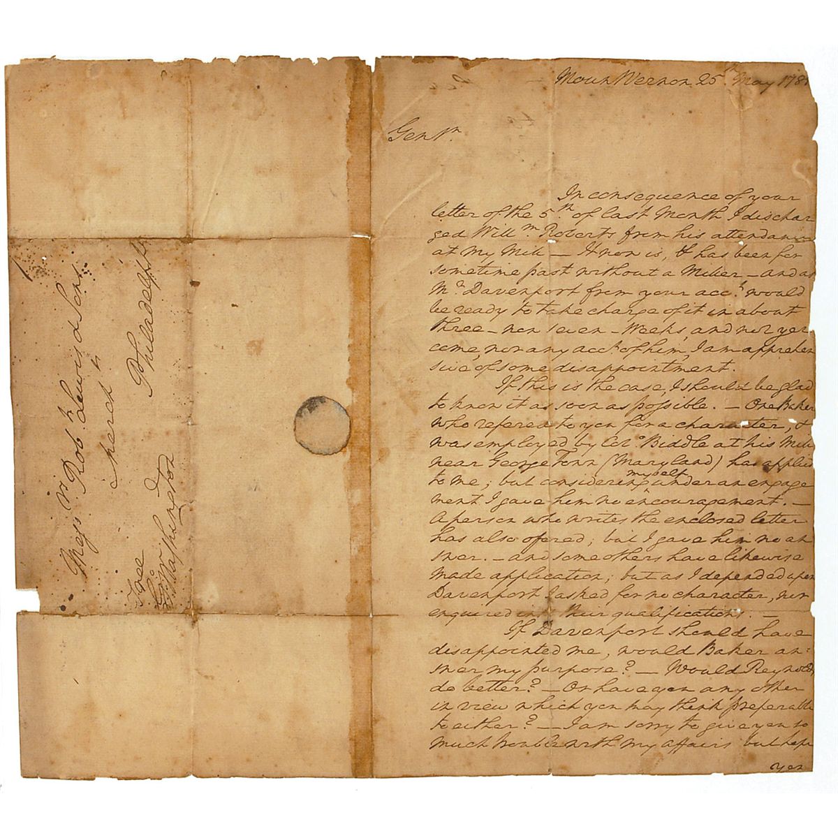 ALS signed “Go: Washington,” one page both sides, 7.25 x 11.75, Mount Vernon, May 25, 1785. Letter to Major Robert Lewis and Sons. In full: “In consequence of your letter of the 5th of last month, I discharged Willm Roberts from his attendance at my Mill. It now is, & has been for some times past without a Miller—and as Mr. Davenport from your acct would be ready to take charge of it in about three, not seven, weeks, and not yet come, and nor any acct of him, I am apprehensive of some disappointment.