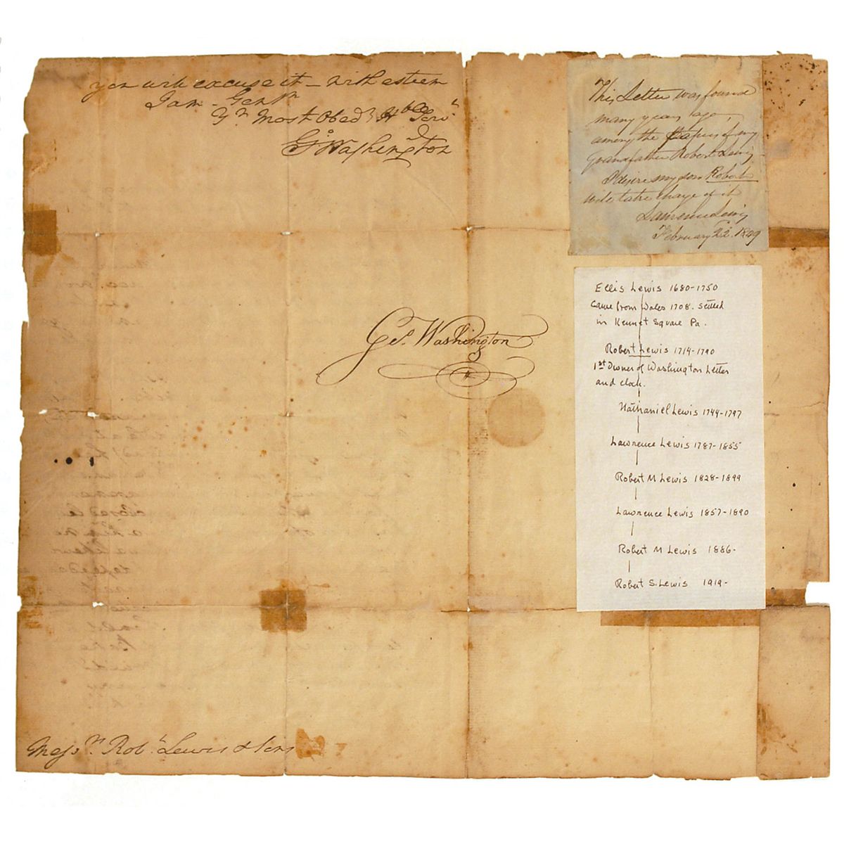 Two slips are affixed to the inside of the second integral page. One reads, “This letter was found many years ago, among the papers of my grandfather Robert Lewis. I desire my son Robert will take charge of it. Laurence Lewis, February 22, 1849.” Second slip traces the Lewis genealogy from Ellis Lewis (1680–1750) to Robert S. Lewis (b. 1919). Reverse of second integral page bears a free franked address panel in Washington’s hand to “Messrs. Robt Lewis & Sons, Merchts, Philadelphia,” and franked in the lower left, “Free, Go. Washington.” Partial separations along the very fragile intersecting mailing folds, a few trivial areas of paper loss along folds, moderate toning, old tape repairs, a few small areas of paper loss along edges, one area affecting last number in date, and scattered light soiling, otherwise good condition.