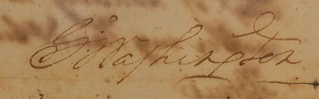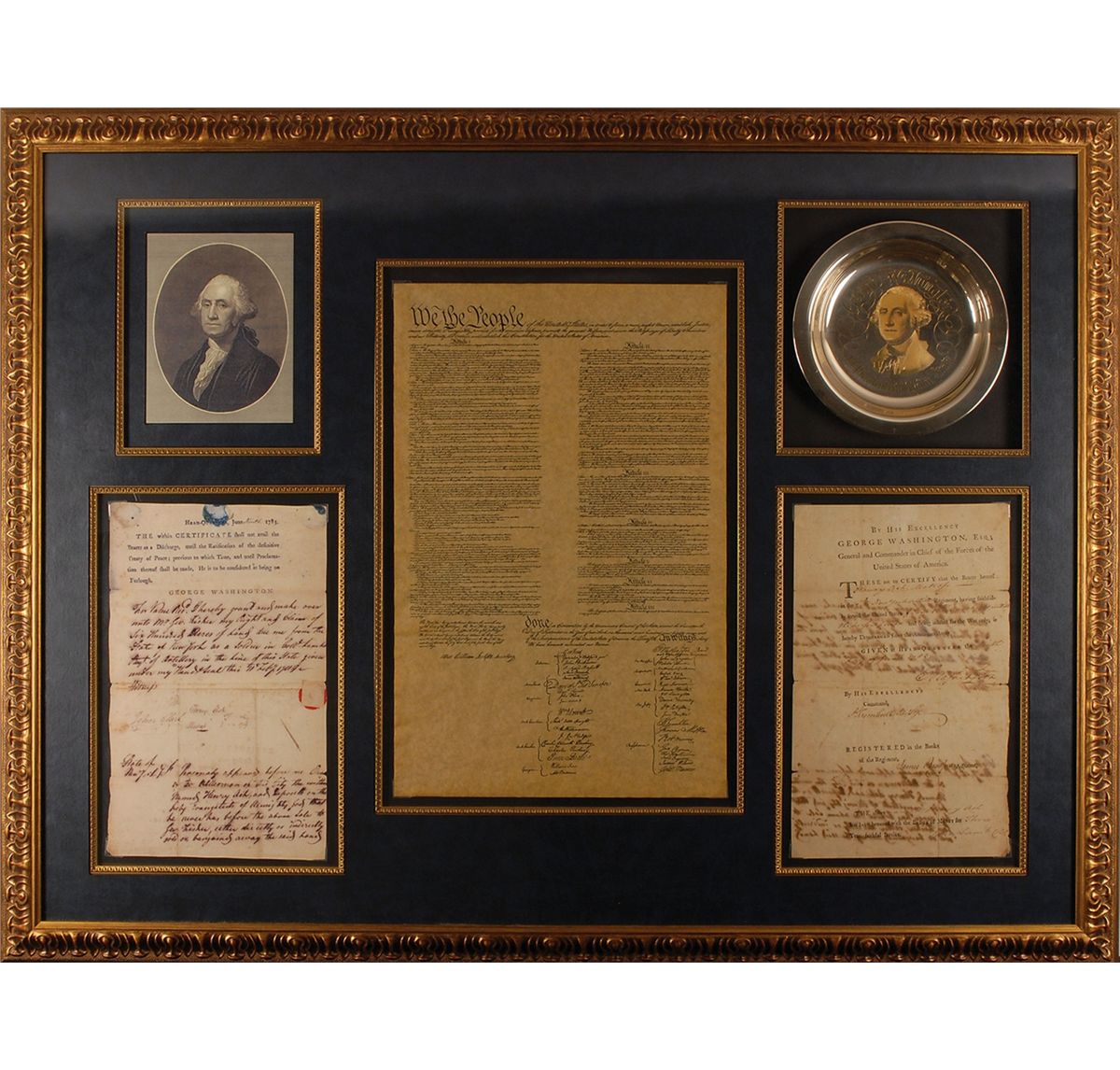 Partly-printed DS, signed “Go: Washington,” one page both sides, 8 x 12.75, June 9, 1783. Washington discharges an enlisted man. Document reads, in full: “By His Excellency George Washington, Esq., General and Commander in Chief of the Forces of the United States of America. These are to certify that the Bearer hereof Henry Ash…having faithfully served the United States from the 12th March 1780, until the present period being enlisted for the War only, is hereby discharged from the American Army.” Signed at the conclusion by Washington, and also signed by Washington’s aide-de-camp Jonathan Trumbull Jr. Bottom of the document also notes that Ash was presented the Badge of Merit for three years of faithful service. Printed on the reverse of the document is a statement reading, “The within certificate shall not avail the Bearer as a Discharge, until the ratification of the definitive Treaty of Peace; previous to which Time, and until Proclamation thereof shall be made, He is to be considered as being on Furlough.” Docketing under the statement in a secretarial hand, dated February 11, 1784, reads, “For value rec’d I hereby grant and make over unto Mr. Geo. Fisher my right and claim of Six Hundred Acres of land due me from the State of New York as a Soldier in Col. Lamb’s Regt. of Artillery in the Line of this State given under my hand.” A further statement at the bottom attests that Ash had not previously bargained away the land. Magnificently gilt-matted and framed with a well-done copy of the reverse of the document, a large copy of the U. S. Constitution, a gold-inlaid, sterling silver portrait plate issued in a limited edition by the Franklin Mint in the early-to-mid 1970s, and a portrait of Washington, to an overall size of 41 x 32. In good to very good condition, with intersecting folds, one through a single letter of signature, a few small separations to edges of folds, scattered toning, moderate show-through from writing on reverse, some behind signature, and a couple small mounting remnants to top edge of reverse. Oversized.