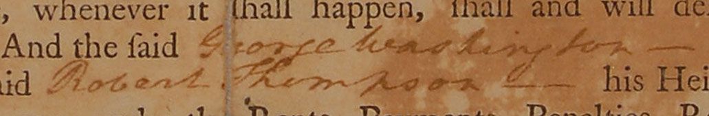 Fantastic display consisting of a scarce full ink signature, “George Washington,” on an off-white 4 x 1 slip clipped from a larger document. Signature was part of a large March 17, 1769, indenture between Washington and Robert Thompson; Thompson’s name is also written on the slip by Washington. Also included is a .5 x .75 swatch of Washington’s cloak from the family of Colonel Tobias Lear, Washington’s personal secretary and good friend; and six strands of Washington’s hair from the Custis-Powell family. All three items are nicely cloth-matted and framed, with a color portrait of Washington and a descriptive plaque to an overall size of 14.75 x 15.25. In very good condition, with moderate toning to slip, not affecting legibility of the signature, and a vertical separation through a single letter of signature. Accompanied by a copy of the document from where the signature was taken, and also accompanied by an 8.5 x 11 photocopied presentation sheet with an image of Washington, bearing a printed signature of Charles Hamilton stating that the hair was probably first owned by Martha Washington’s granddaughter. Complete Washington signatures are seldom seen.