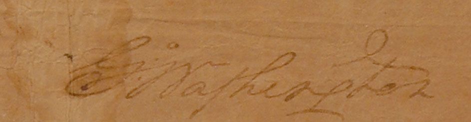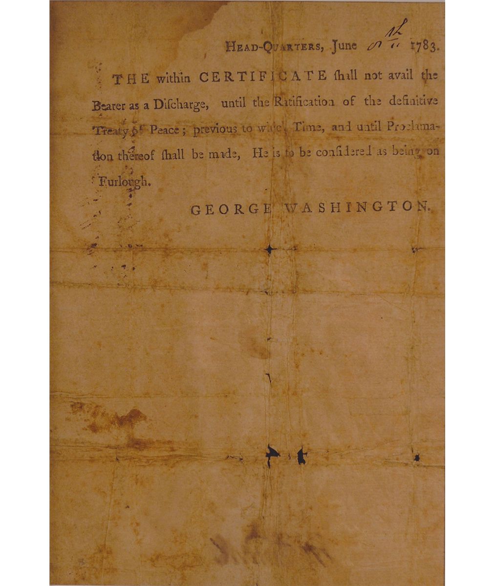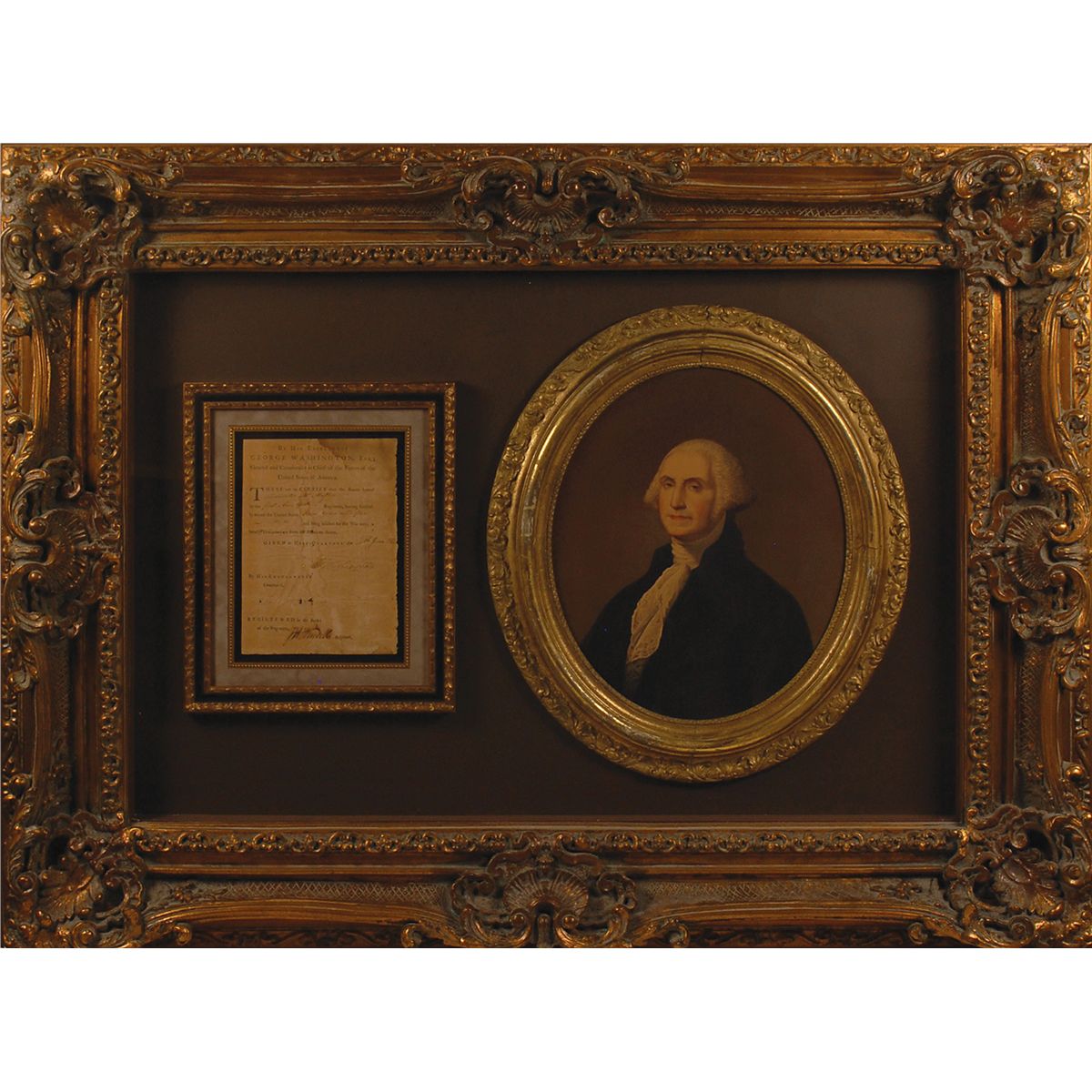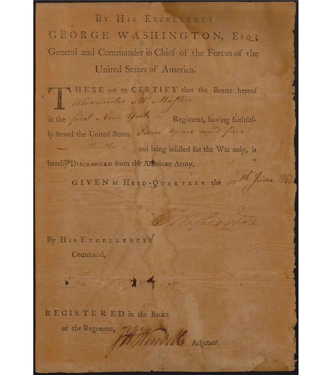 Partly-printed DS, signed “Go: Washington,” one page both sides, 6.75 x 10, June 1, 1783. Discharge reads, in part: “By His Excellency George Washington, Esq General and Commander in Chief of the Forces of the United States of America. These are to certify that the bearer hereof Alexander McMasters in the first New York Regiment having faithfully served the United States Seven years and four months and being inlisted [sic] for the War only, is hereby Discharged from the American Army.” Signed at the conclusion by Washington and countersigned by the regimental adjutant. Document is suede-matted and framed to an overall size of 115.5 x 15, and in turn grandly matted and framed with an original framed color period 14 x 17 oval portrait of Washington, so the reverse of both items can be seen, to an overall size of 49 x 37. In good condition, with intersecting folds, a few areas of dampstaining, a bit affecting beginning of signature, a few small areas of paper loss along one horizontal fold, and mild creasing.