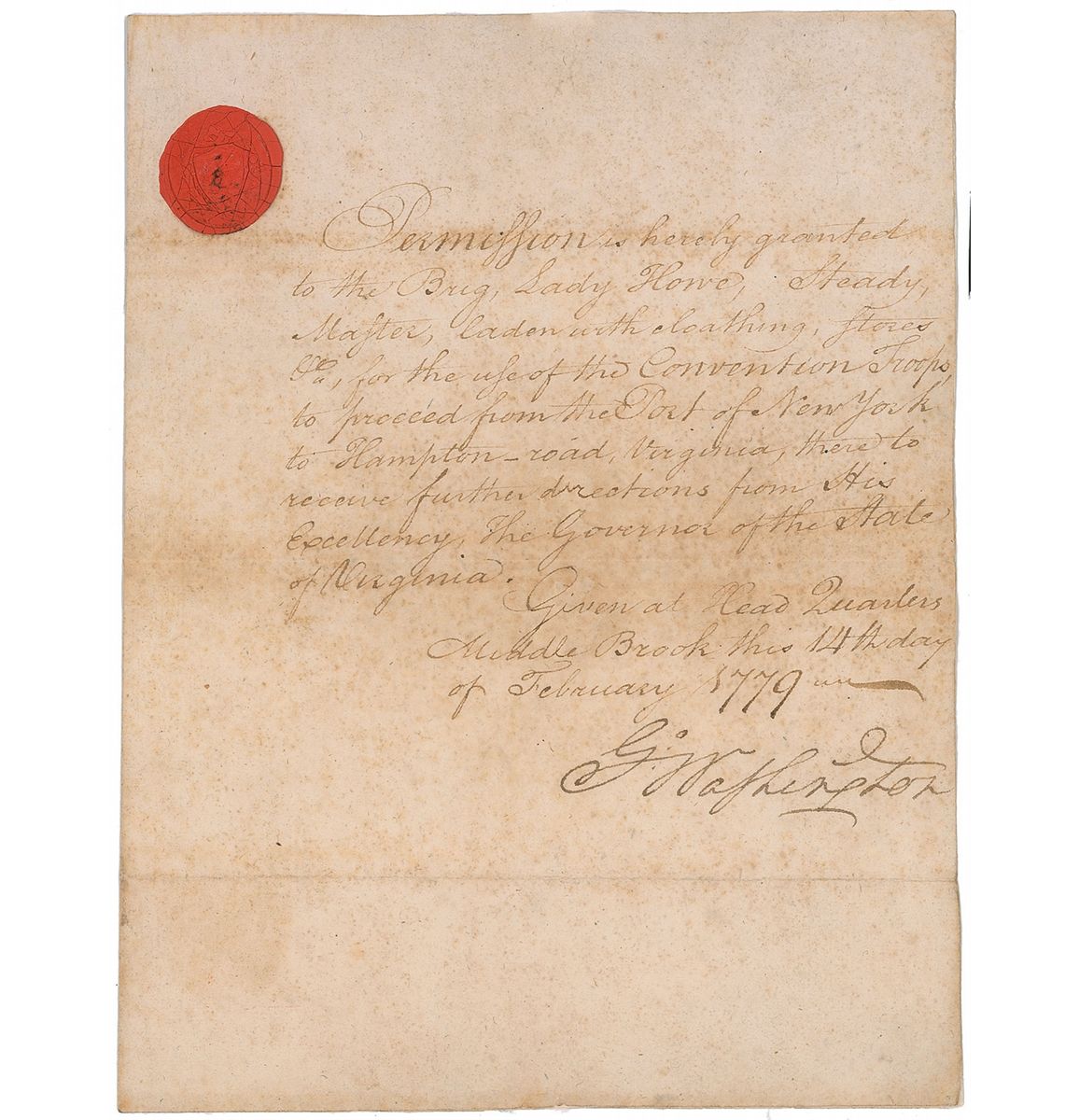 Very rare war-dated manuscript DS, signed “Go: Washington,” one page, 7.25 x 9.5, February 14, 1779. A ship’s passport from Washington, one of three issued on this date, for a vessel supplying British prisoners in Saratoga. In full: “Permission is hereby granted to the Brig. Lady Howe, Steady, Master, laden with cloathing, stores &c for the use of the Convention Troops, to proceed from the Port of New York to Hampton-road, Virginia, there to receive further directions from His Excellency, the Governor of the State of Virginia." Washington’s red wax signet is in the upper left of the page, with some light cracks, but still intact. In very good condition, with document having been professionally cleaned, several well-done professional repairs to paper loss, with a couple very minor touch-ups to text, and scattered toning. Provenance: Christie’s 2004.