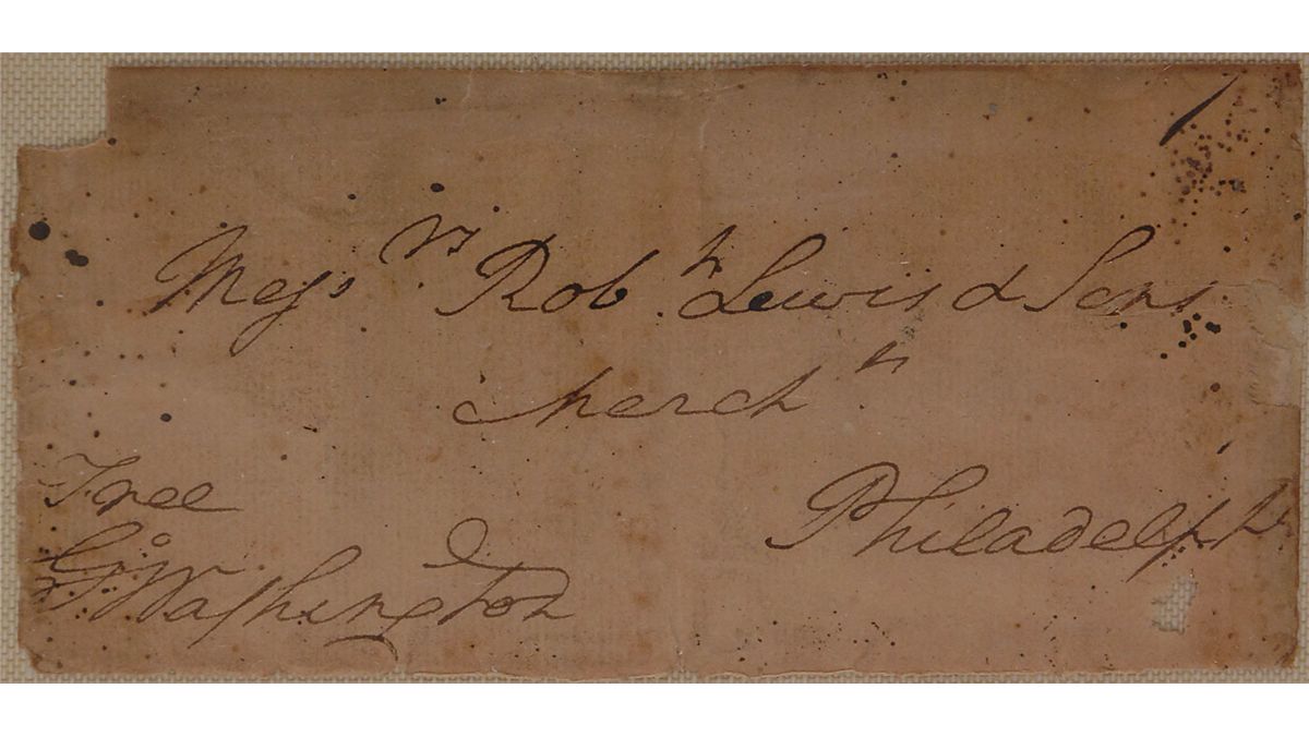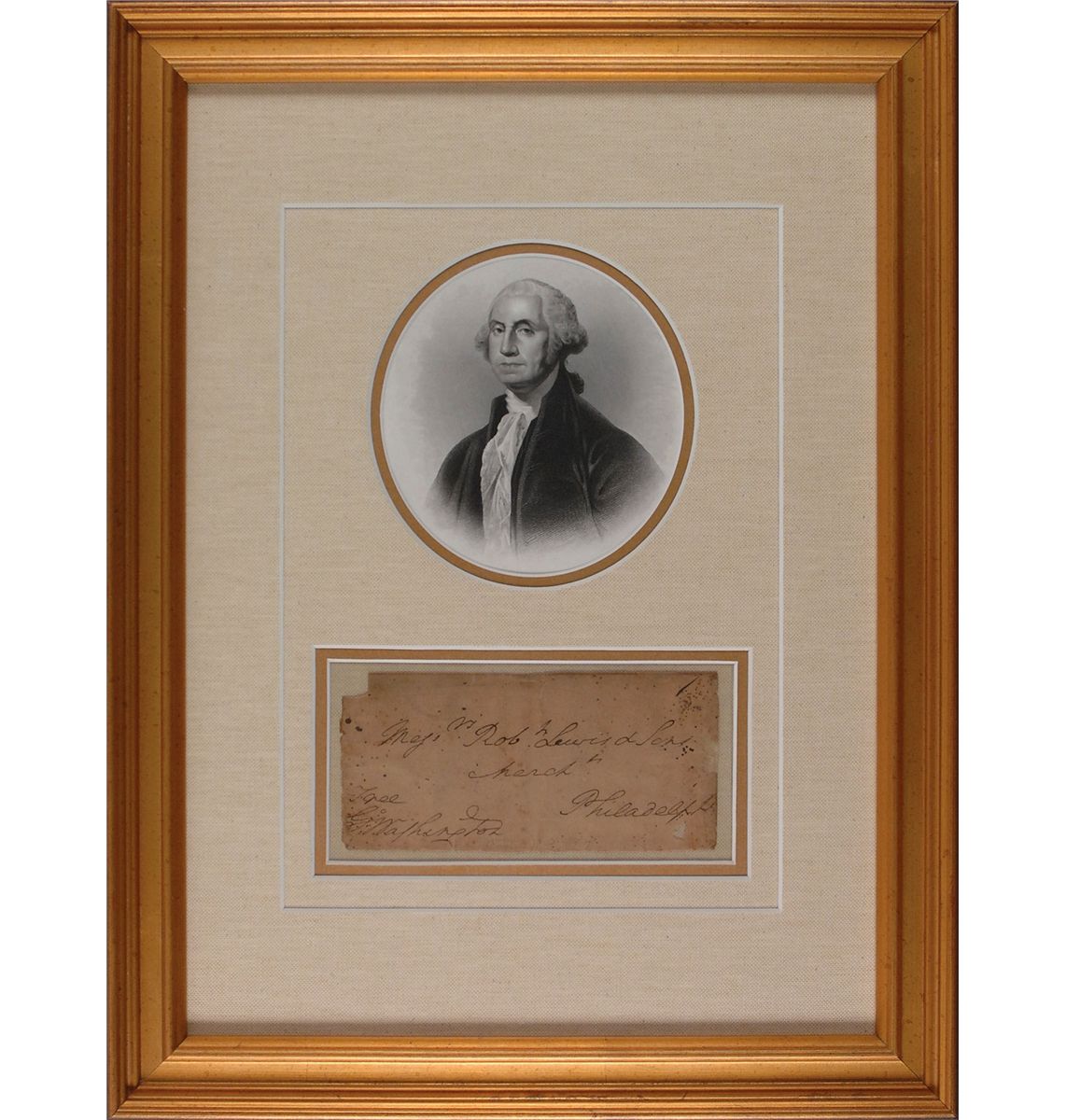 Hand-addressed free frank, 6 x 3, addressed by Washington to, “Messrs Rob.t Lewis & Sons, Merchs., Philadelphia.” and franked in the lower left corner, “Free G:o Washington.” Archivally triple-cloth-matted and framed with a portrait of Washington to an overall size of 13.5 x 18. In very good condition, with a couple small holes and areas of paper loss, uniform toning, and a bit of light spotting, with nothing detracting from the bold writing and signature.