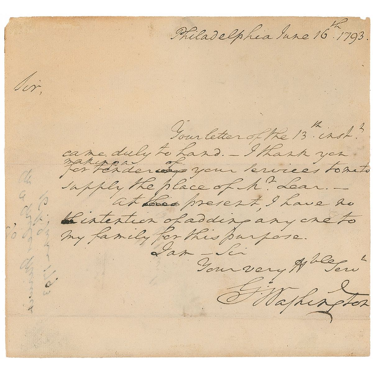 Having served as Washington’s personal secretary and right-hand man since 1784, Tobias Lear decided to leave his post at the beginning of the president’s second term in 1793. He started T. Lear & Company, focused on land speculation in Washington, DC, and the promotion of river traffic to the soon-to-be nation’s capitol with Washington’s Potomac Company; unfortunately, the venture quickly proved unsuccessful, leading to immense financial difficulties that would continue to plague Lear for the remainder of his life. When Miles Merwin, former teacher at the Friends' Latin School in Philadelphia and instructor of Martha’s grandson George Washington Parke Custis, wrote to Washington offering his “services…to supply the place of Mr. Lear,” the president showed his loyalty to his former secretary, rejecting the offer with this letter—he left the position open, and Lear returned the following year, remaining until Washington’s death in 1797. An incredibly scarce and beautifully penned letter from the hand of the America’s first president, holding a place for his much-beloved Mr. Lear.