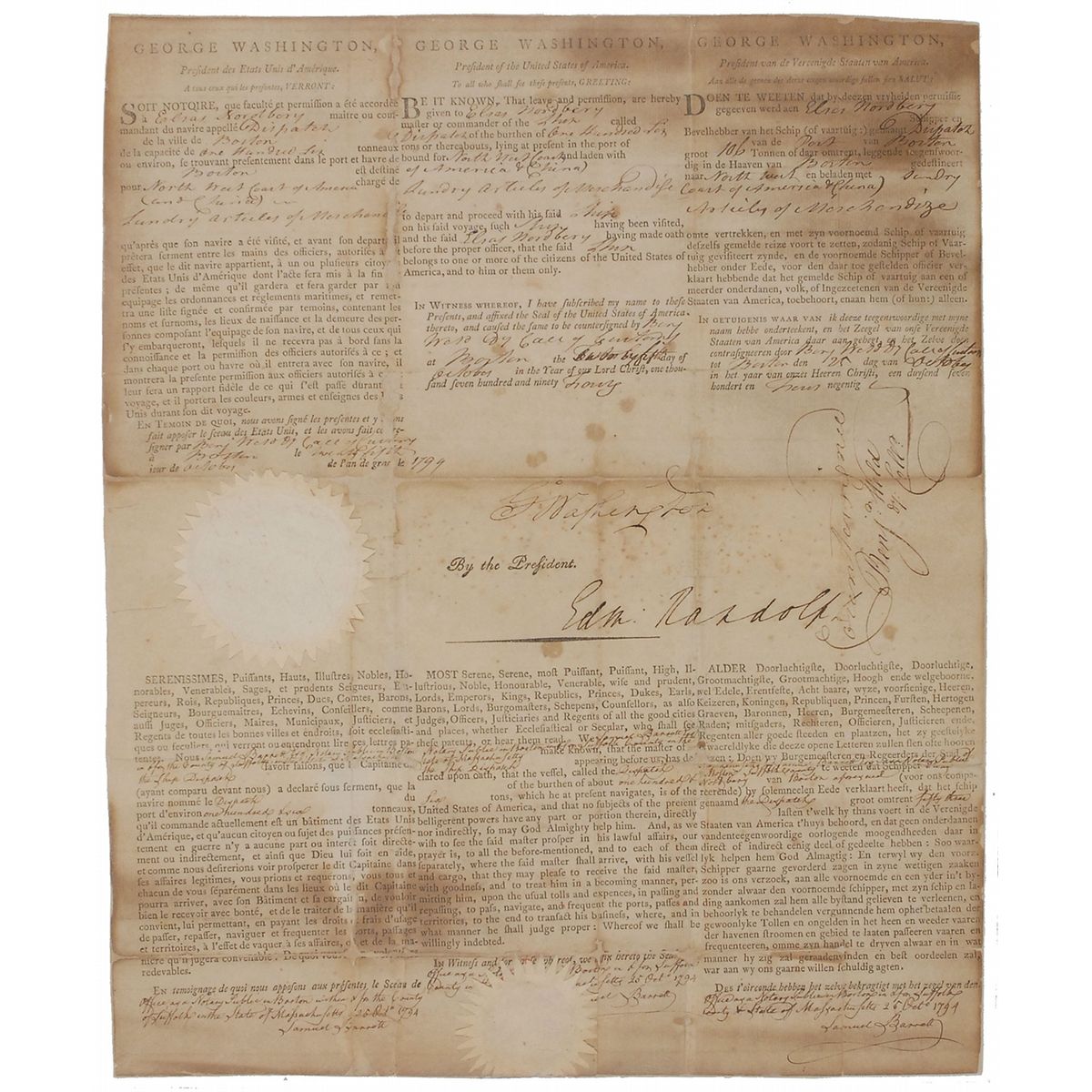 Partly-printed DS as president, signed “Go: Washington,” one page, 12.75 x 15.5, October 25, 1794. Three-language ship’s papers, in French, English, and Dutch, issued to “Elias Nordbery master and commander of the Ship called Dispatch…lying at present in the port of Boston bound for North West Coast of America & China and laden with Sundry Articles of Merchandise to depart and proceed with his said Ship having been visited, and the said Elias Nordbery having made oath before the proper officer, that the said Ship belongs to one or more of the citizens of the United States of America, and to him or them only.” Signed in the middle panel by Washington, and countersigned by Secretary of State Edmund Randolph, Deputy Collector Benjamin Weld, and Judge Samuel Barrett. Document has been professionally repaired on the reverse, with some backing and paper replacement along folds, and has been removably encapsulated in acid-free Mylar. In good to very good condition, with aforementioned repairs and strengthening, scattered toning and foxing, and intersecting folds through two letters of signature. The two white wafer seals are intact.