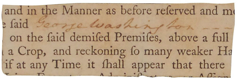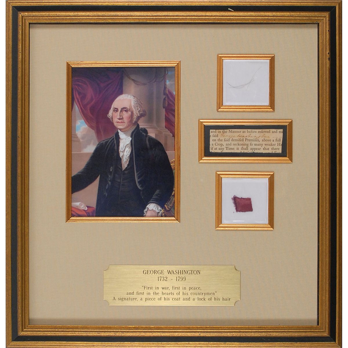 Fantastic display consisting of a scarce full ink signature, “George Washington,” on an off-white 3 x 1 slip clipped from a larger document. Signature was part of a large March 17, 1769, indenture between Washington and Robert Thompson. Also included are a .5 x .5 swatch of Washington’s cloak from the family of Colonel Tobias Lear, Washington’s personal secretary and good friend; and six strands of Washington’s hair from the Custis-Powell family. All three items are nicely cloth-matted and framed with a color portrait of Washington and a descriptive plaque to an overall size of 14.75 x 15.25. In fine condition, with a uniform shade of mild toning. Accompanied by a copy of the document from which the signature was taken, and also accompanied by an 8.5 x 11 photocopied presentation sheet with an image of Washington, bearing a printed signature of Charles Hamilton stating that the hair was probably first owned by Martha Washington’s granddaughter. Complete Washington signatures are highly sought after.