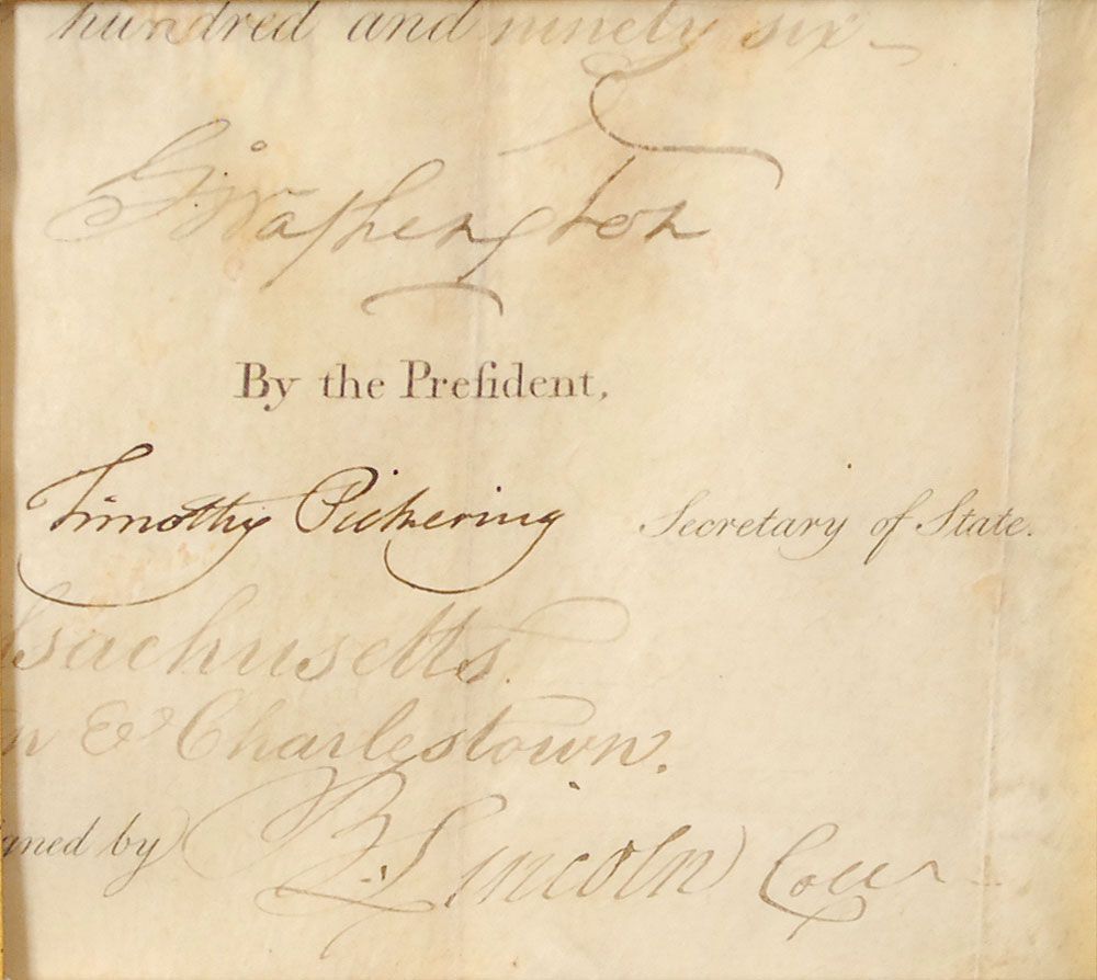 Exquisite ink signature as president, “Go: Washington,” on an off-white 4.5 x 4.5 vellum slip clipped from a document, also signed by Secretary of State Timothy Pickering and dated 1796. Also includes five strands of Washington’s hair in a clear envelope affixed to a certificate of authenticity from Charles Hamilton. In fine condition, with a vertical fold passing through a single letter of Washington’s signature. Additional accompaniments are a 1776 Connecticut six-pence banknote, and a manuscript pay order document for Nathaniel Brown, a soldier in the Connecticut line of the Continental Army, dated 1781.