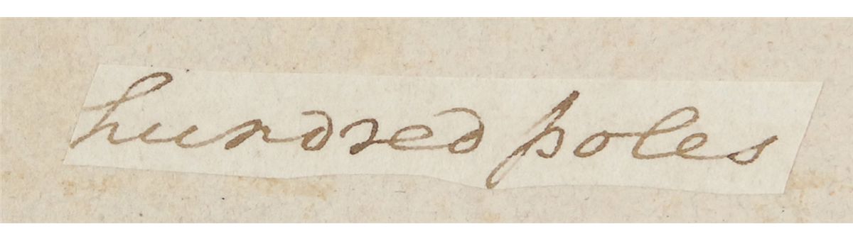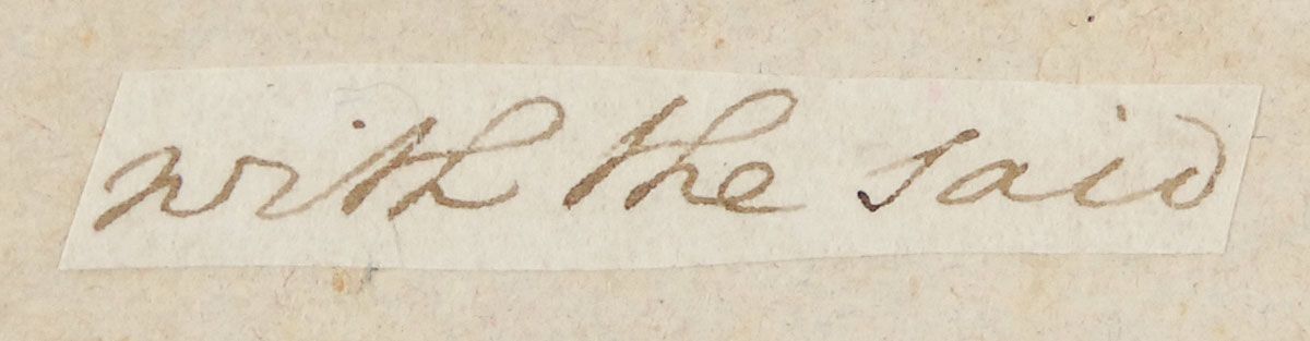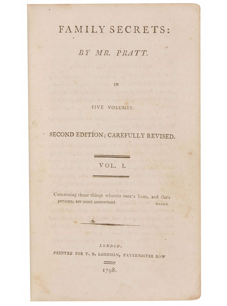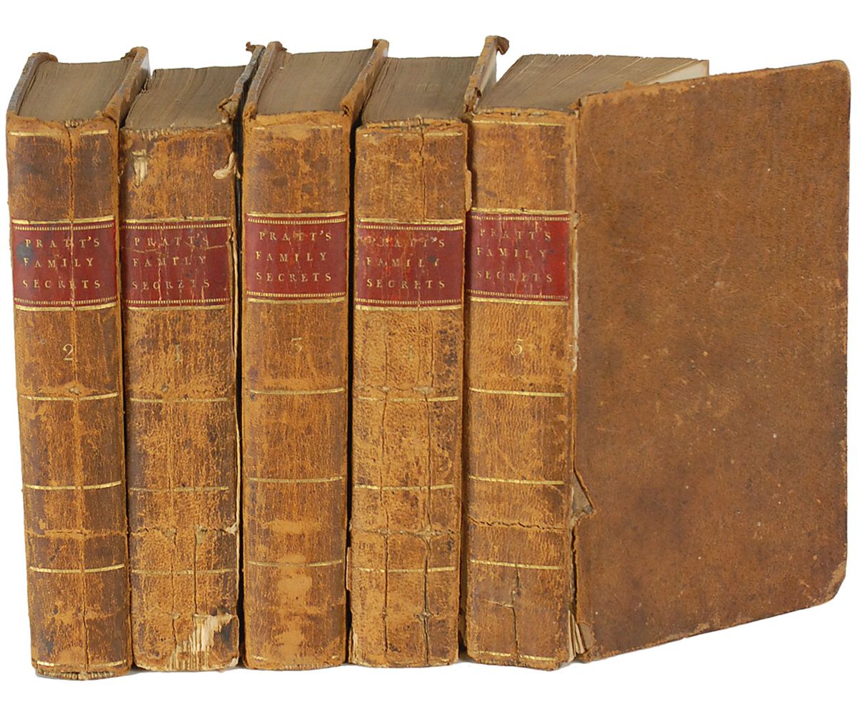 Magnificent five-volume set from the library of George Washington entitled “Family Secrets: By Mr. Pratt. In Five Volumes. Carefully Revised,” London, Paternoster Row, 1798, with each hardcover volume measuring 4 x 6.75. Each volume has clipped words in Washington’s hand affixed to an opening page or front pastedown. Words are: Volume I, “[de]grees east eight”; Volume II, “hundred poles”; Volume III, “with the said”; Volume IV, “ridge to a”; and Volume V, “sugar tree.” Ornately bordered personal bookplates of Benjamin Lincoln Lear are affixed to the front pastedowns of the first four volumes. Books are in overall good condition, bound in full calf. Exteriors significantly worn, with small bumps, chips, and tears along edges, several tears in leather over spines, and expected soiling. Interiors exhibit minor discoloration and scattered foxing but are overall clean. Rear board of Volume I is missing, front board is attached by a few threads, and there is a small pencil notation to the front free endpaper. Volume IV is missing both boards, and Volume V’s boards are both hanging on by a few threads. Set is housed in a stunning custom-made clamshell box with two red spine labels gilt lettered, “Pratt’s Family Secrets / 1798” and “From the library of George Washington.” These books were originally part of an auction that included items from the Tobias Lear family. Lear was Washington’s closest confidant and personal secretary, serving Washington from 1784–1799. Accompanied by color photocopies of the first page of a list titled “Catalogue of Books received from Washington,” with a second page starting with “Pratt Family Secrets.” An extraordinary collection boasting five examples in Washington’s hand.